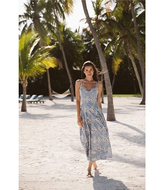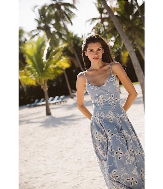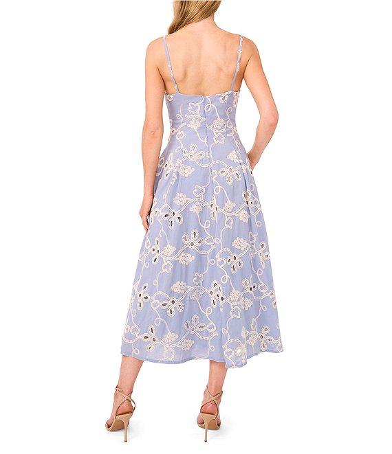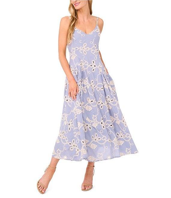 From CeCe, this dress features: Woven fabrication V-neckline Sleeveless Floral embroidery Bottom godets Maxi length Lined Side zipper closure Approx. 48.75" in length Cotton Machine wash/line dry Imported.