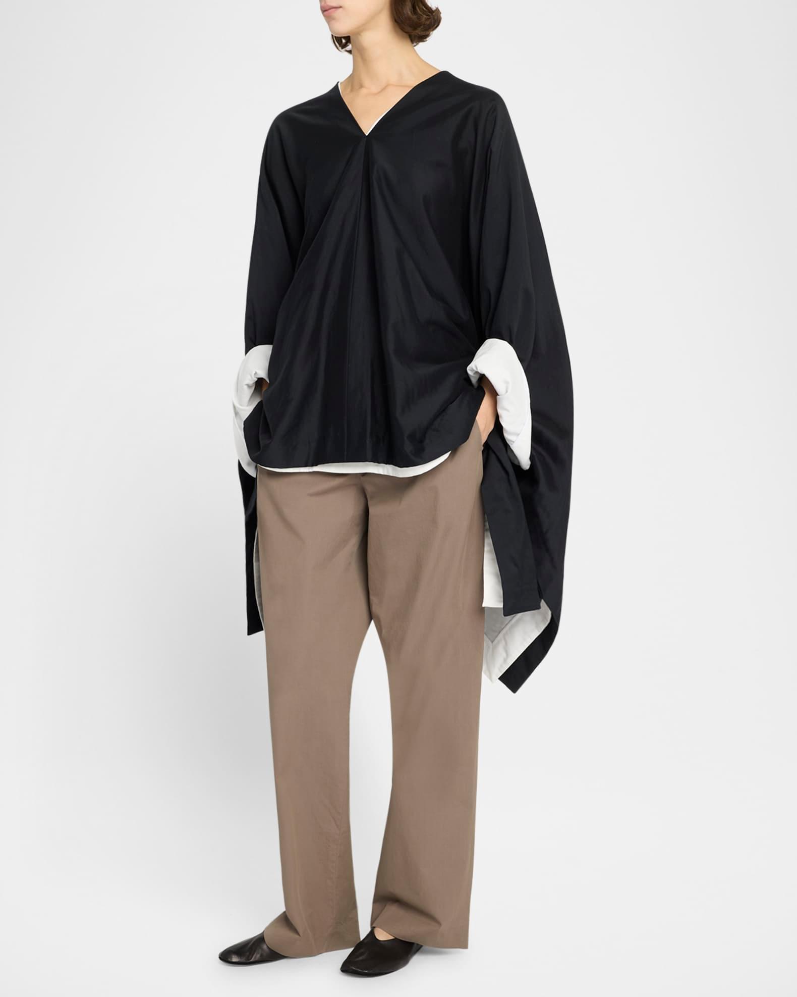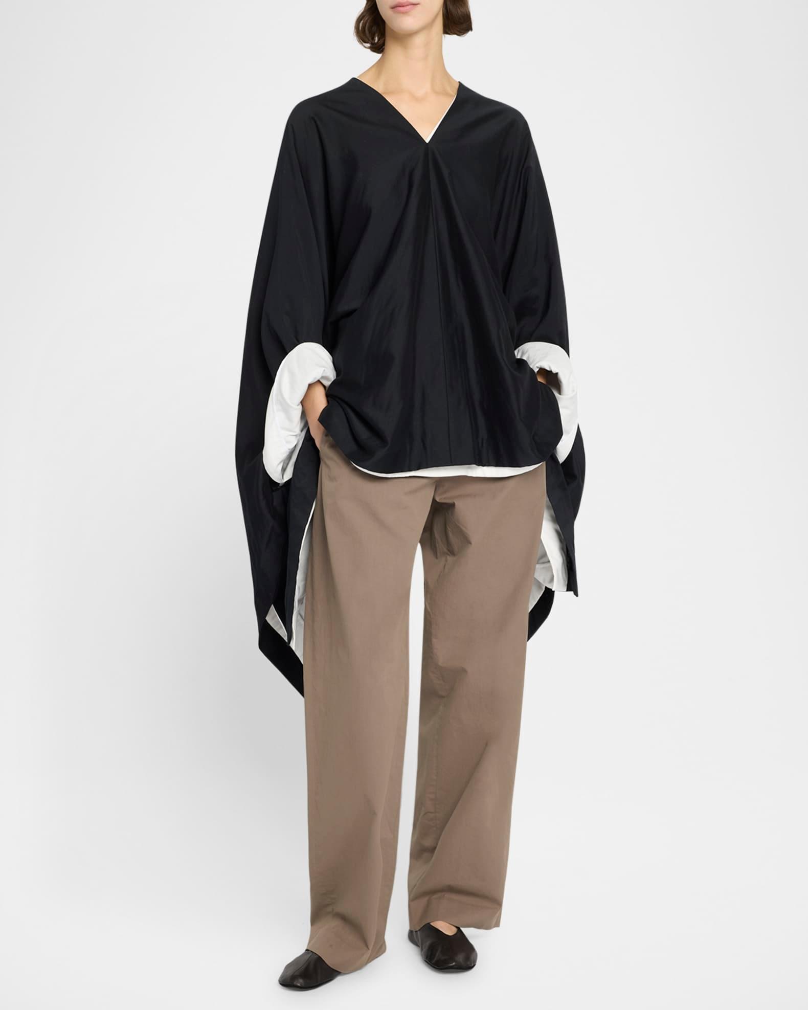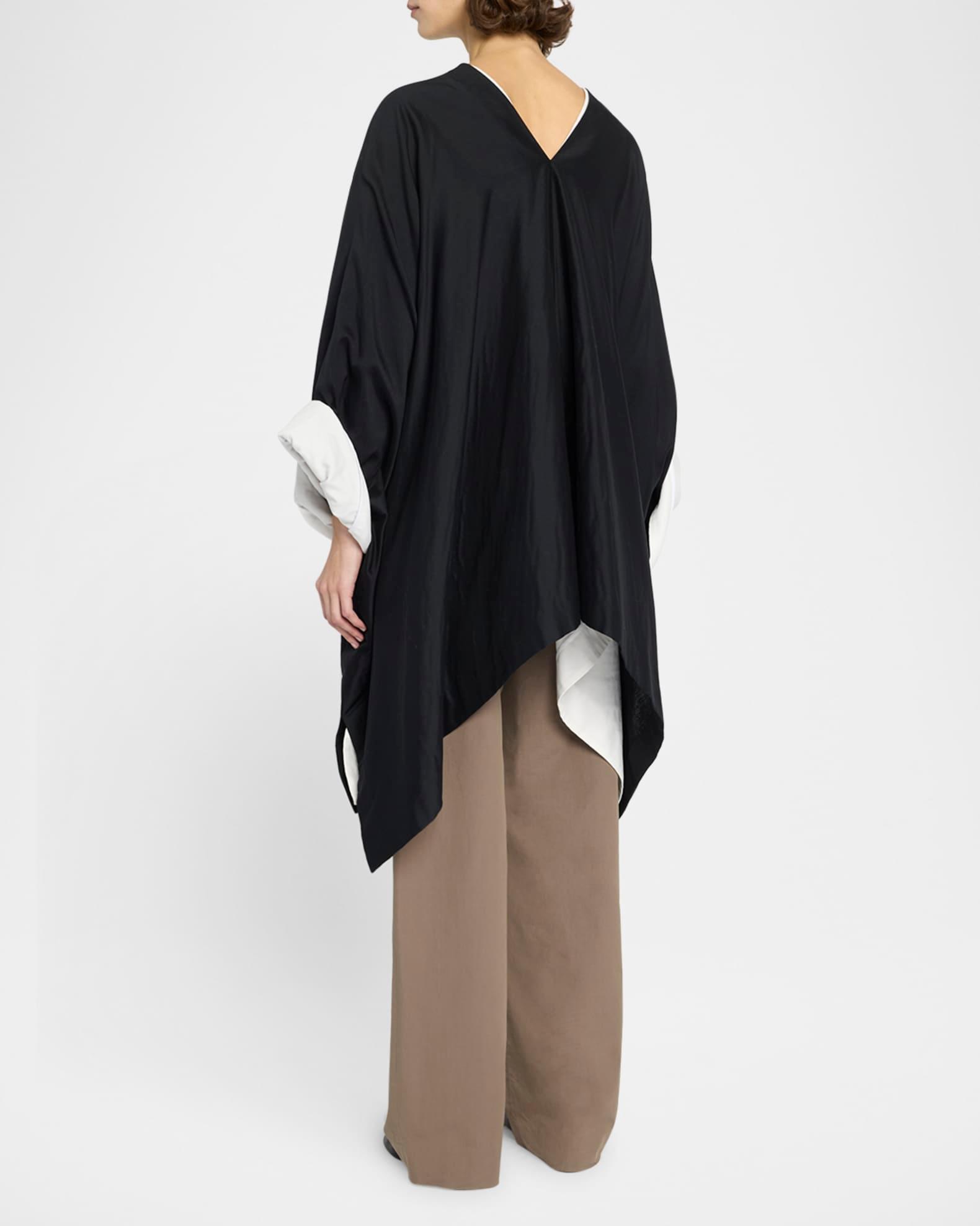 THE ROW "Cedar" poncho top in a heavyweight silk satin with a handkerchief hem V neckline Long sleeves Oversized fit Hem falls below the hip Pullover style Cotton/silk Made in Italy