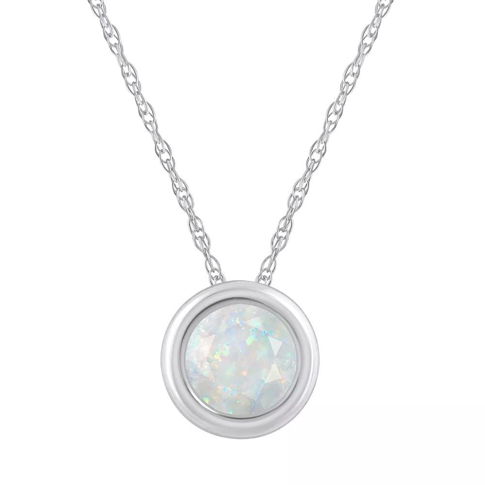 Youll love the beautiful style of this Celebration Gems 10k Gold 5 mm Round Lab-Created Opal Pendant Necklace. Click on this JEWELRY & WATCHES GUIDE to learn about fit, styles, materials and more! Youll love the beautiful style of this Celebration Gems 10k Gold 5 mm Round Lab-Created Opal Pendant Necklace. Click on this JEWELRY & WATCHES GUIDE to learn about fit, styles, materials and more! FEATURES Pendant dimensions: 1/4 in. x 1/4 in. Chain length: 18 in. Chain type: rope Clasp: spring-ring Metal: 14k white gold, 14k gold Plating: rhodium Finish: polished Packaging: boxed Nickel freeSTONE DETAILS Stone type: lab-created opal Stone size: 5 mm Shape: round Setting: bezel Gemstones may have been treated to enhance their appearance. Special care may be required. Please visit our Gemstone Treatment & Special Care Guide for more information. Size: 18. Color: 10k White Gold. Gender: female. Age Group: adult.