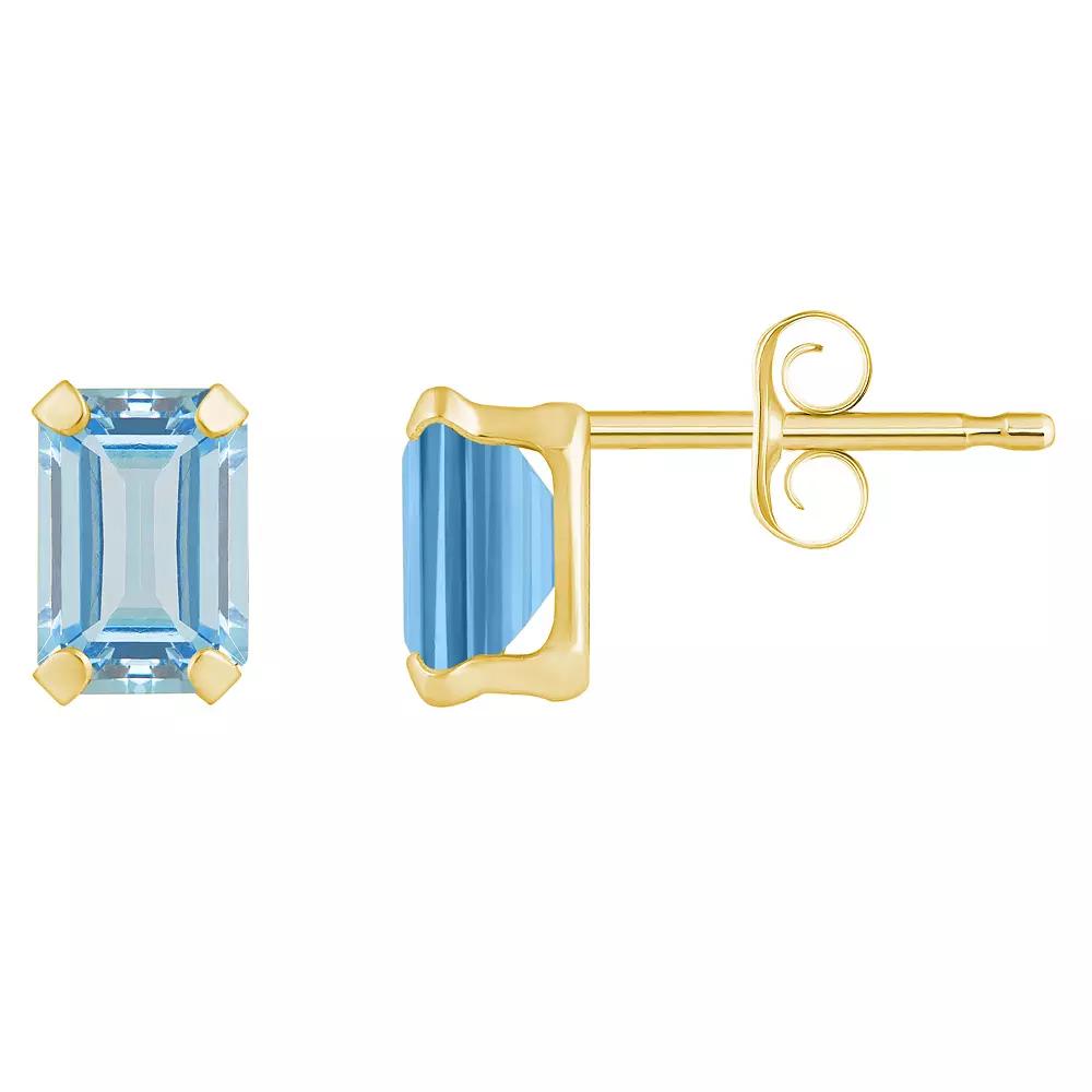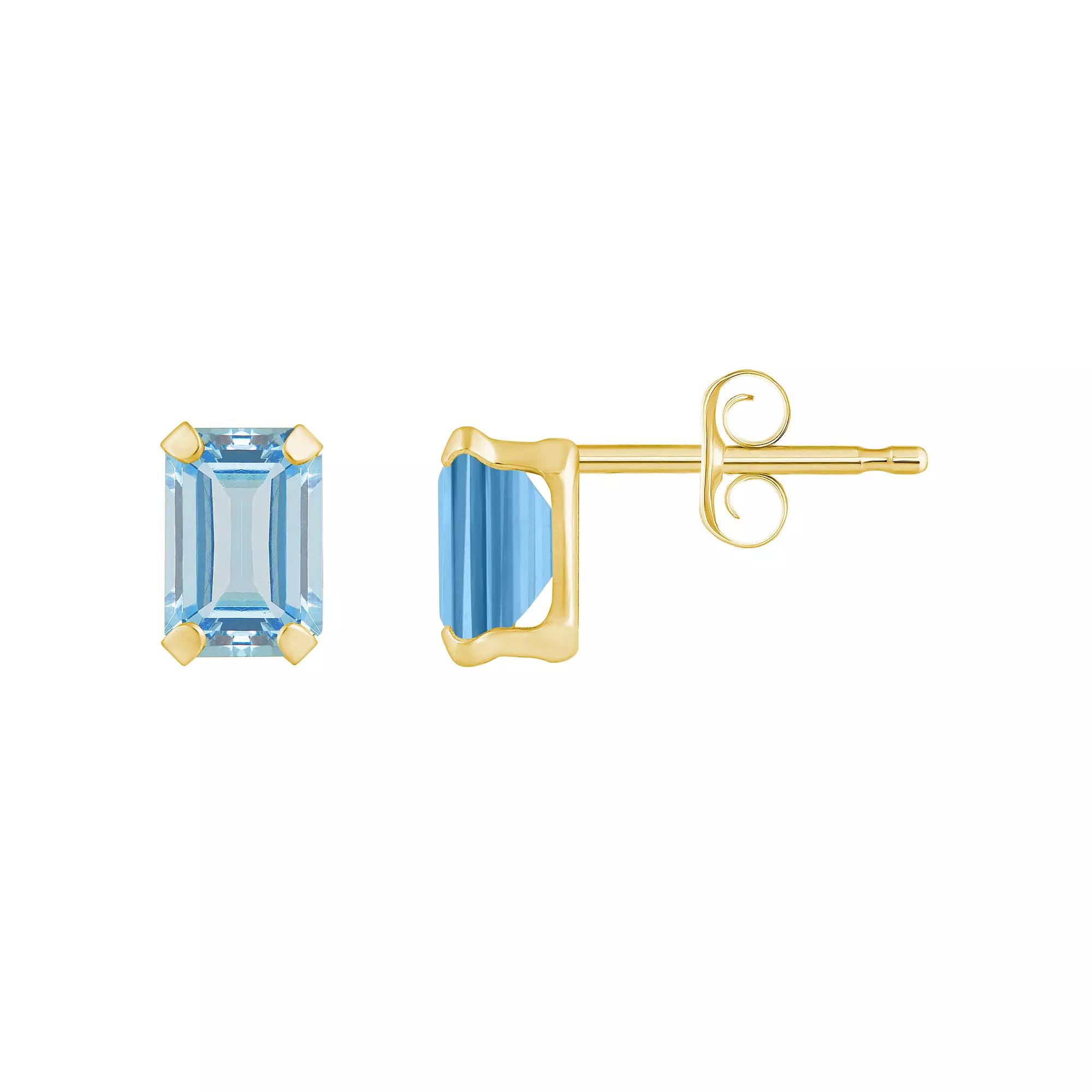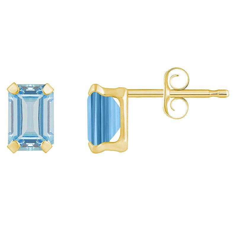 Complete your look in an eye-catching way with these 10k gold emerald-cut aquamarine stud earrings. Complete your look in an eye-catching way with these 10k gold emerald-cut aquamarine stud earrings. Length: 1/4 in. Backings: post Nickel free Metal: 10k white gold, 10k gold Plating: rhodium Finish: polished Packaging: boxedSTONE DETAILS Stone type: aquamarine Total weight: 1 ct. Center stone size: 6 mm x 4 mm Shape: emerald cut Setting: prong Gemstones may have been treated to enhance their appearance. Special care may be required. Please visit our Gemstone Treatment & Special Care Guide for more information. Please note, due to the high value of this item, a signature may be required upon delivery. Color: Blue. Gender: female. Age Group: adult.