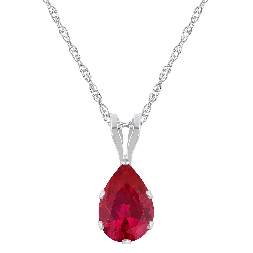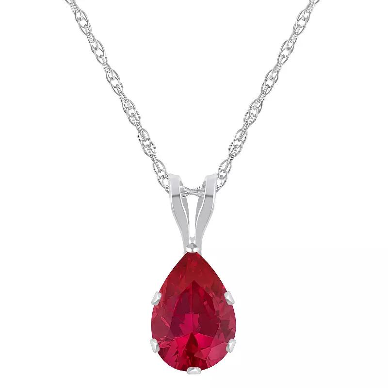 Accessorize in style with this Celebration Gems 10k gold pear-shape lab-created ruby pendant necklace. Click on this JEWELRY & WATCHES GUIDE to learn about fit, styles, materials and more! Accessorize in style with this Celebration Gems 10k gold pear-shape lab-created ruby pendant necklace. Click on this JEWELRY & WATCHES GUIDE to learn about fit, styles, materials and more! FEATURES Pendant size: 3/8 x 1/5 Chain length: 18 in. Chain type: rope Clasp: spring-ring Nickel free Metal: 10k white gold, 10k gold Plating: rhodium Finish: polished Packaging: boxedSTONE DETAILS Stone type: lab-created ruby Total weight: 9/10 ct. Shape: pear Setting: prong Gemstones may have been treated to enhance their appearance. Special care may be required. Please visit our Gemstone Treatment & Special Care Guide for more information. Size: 18. Gender: female. Age Group: adult.
