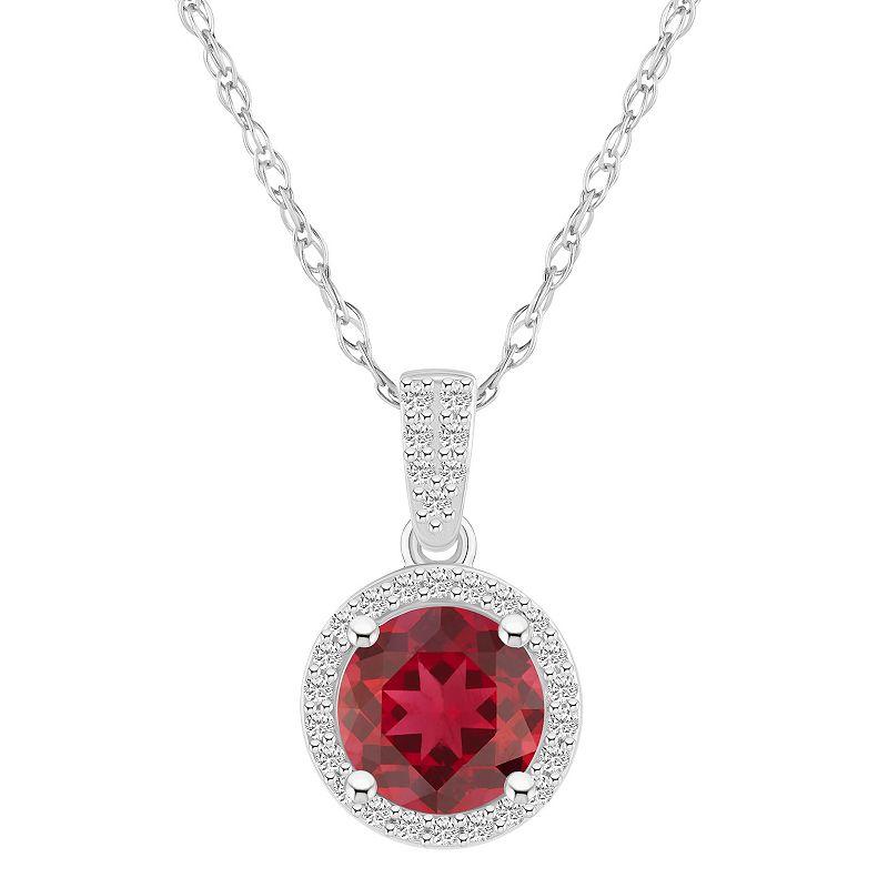 Crafted from 10k white gold, this gemstone and lab-created white sapphire halo pendant lends a touch of elegance to your favorite outfits. Crafted from 10k white gold, this gemstone and lab-created white sapphire halo pendant lends a touch of elegance to your favorite outfits. Pendant size: 2/3L x 3/8W Chain length: 18 in. Chain type: rope Metal: 10k white gold Plating: rhodium Finish: polished Packaging: boxedSTONE DETAILS Center stone size: 7 mm Shape: round Setting: prong Gemstones may have been treated to enhance their appearance. Special care may be required. Please visit our Gemstone Treatment & Special Care Guide for more information. Please note, due to the high value of this item, a signature may be required upon delivery. Size: 18. Gender: female. Age Group: adult.