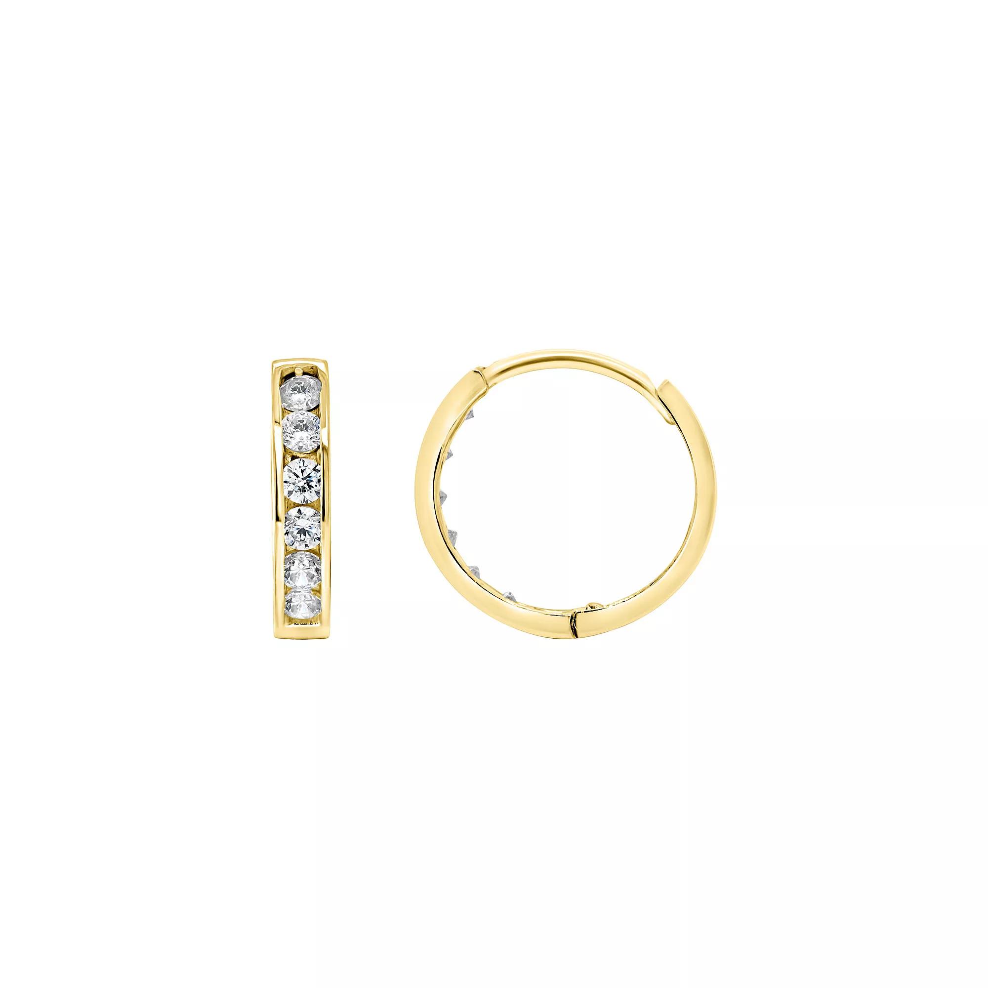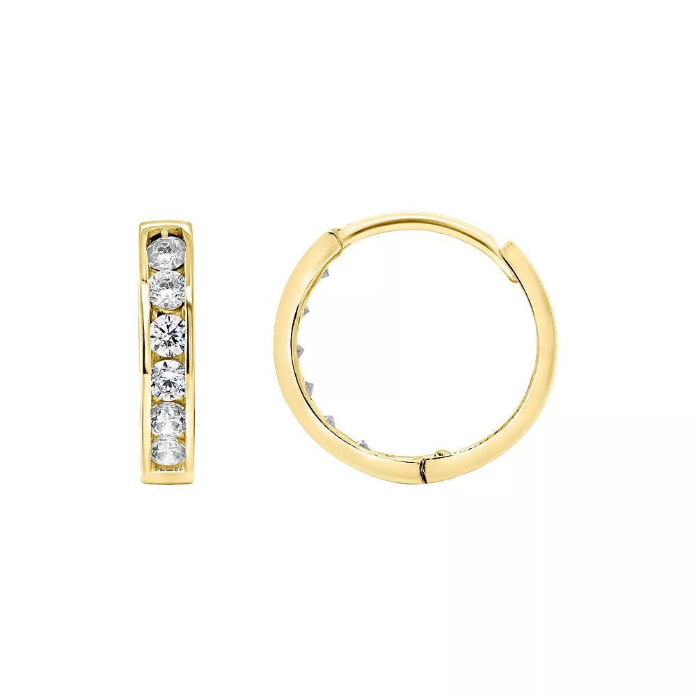Decorated with dazzling, round-cut cubic zirconia gemstones, these 14k gold huggie hoops are sure to light up your look. Decorated with dazzling, round-cut cubic zirconia gemstones, these 14k gold huggie hoops are sure to light up your look. Length: 3/8 in. Backings: click-it Metal: 14k gold Plating: rhodium Finish: polished Packaging: boxedSTONE DETAILS Stone type: cubic zirconia Total weight: 1/4 ct. Shape: round brilliant Setting: channel Size: One Size. Color: White. Gender: female. Age Group: adult.