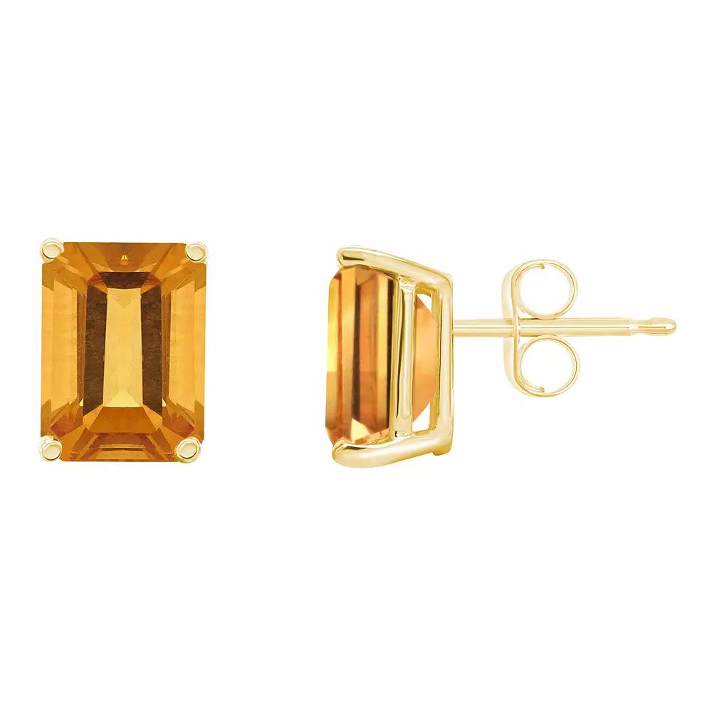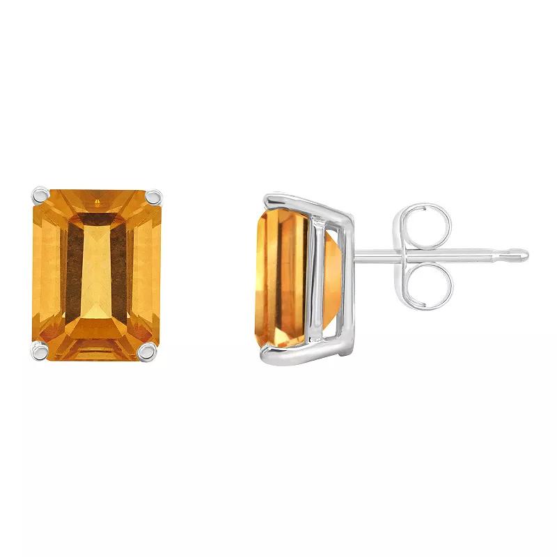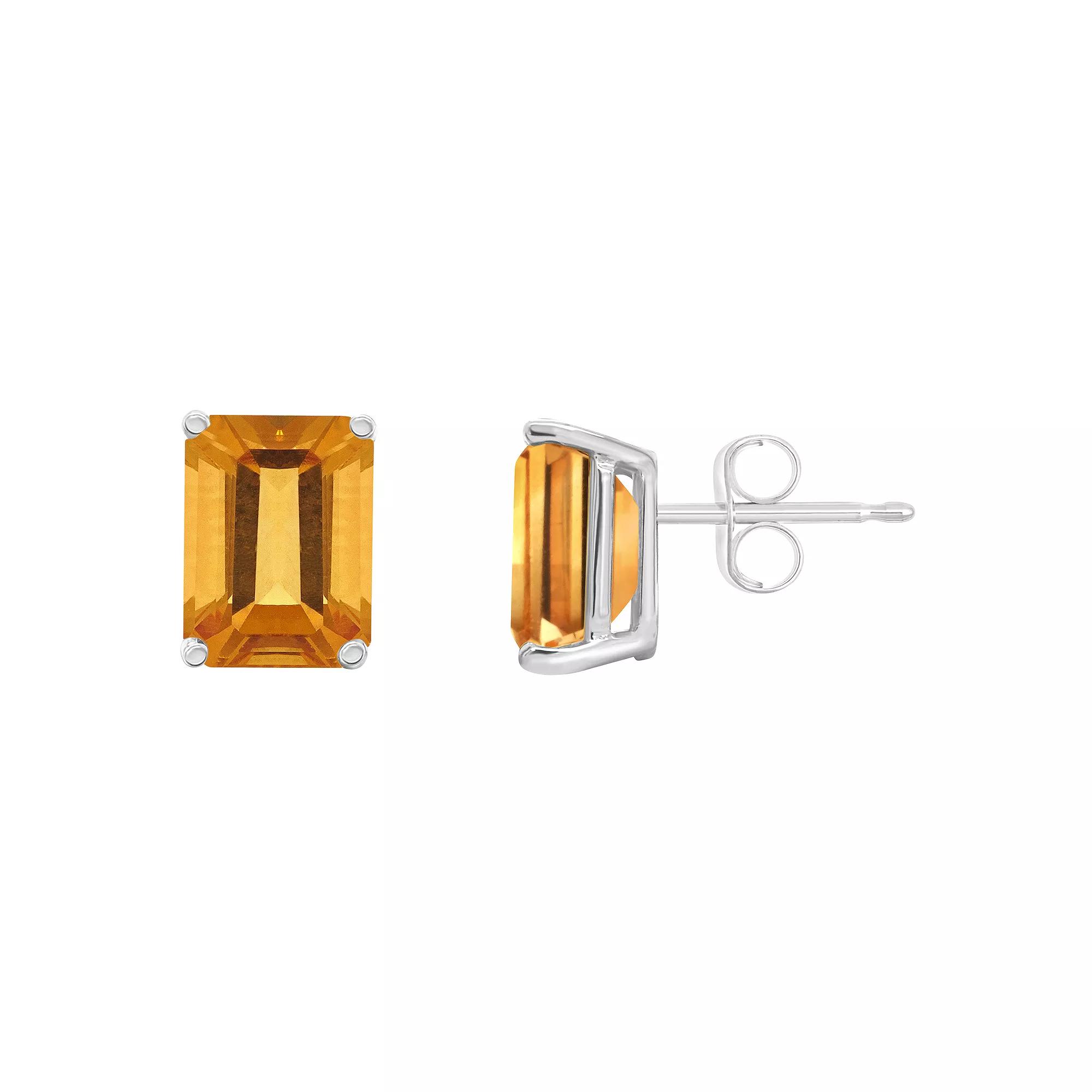 Complete your look in an eye-catching way with these emerald-cut citrine stud earrings. Complete your look in an eye-catching way with these emerald-cut citrine stud earrings. Length: 1/3 in. Backings: post Metal: 14k gold Plating: rhodium Finish: polished Packaging: boxedSTONE DETAILS Stone type: citrine Total weight: 3 1/5 ct. Stone size: 8 mm x 6 mm Shape: emerald cut Setting: prong Gemstones may have been treated to enhance their appearance. Special care may be required. Please visit our Gemstone Treatment & Special Care Guide for more information. Please note, due to the high value of this item, a signature may be required upon delivery. Color: Orange. Gender: female. Age Group: adult.
