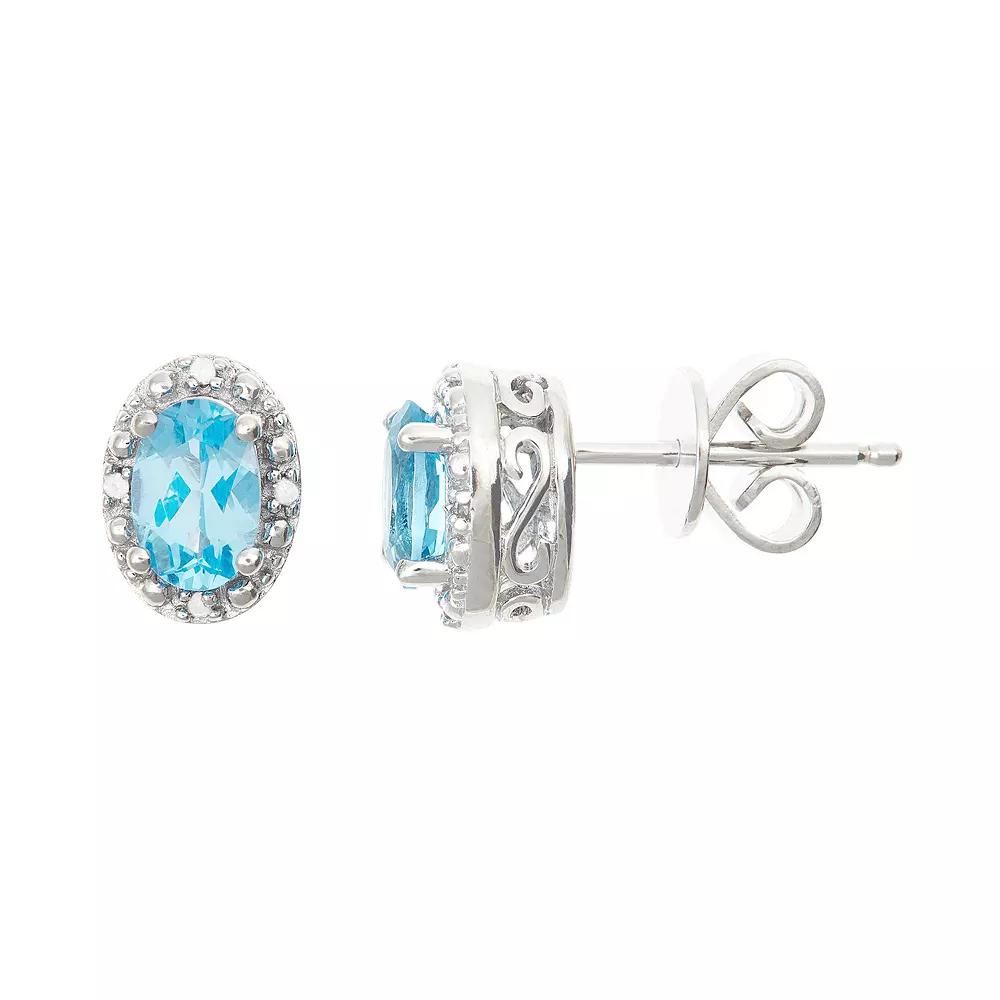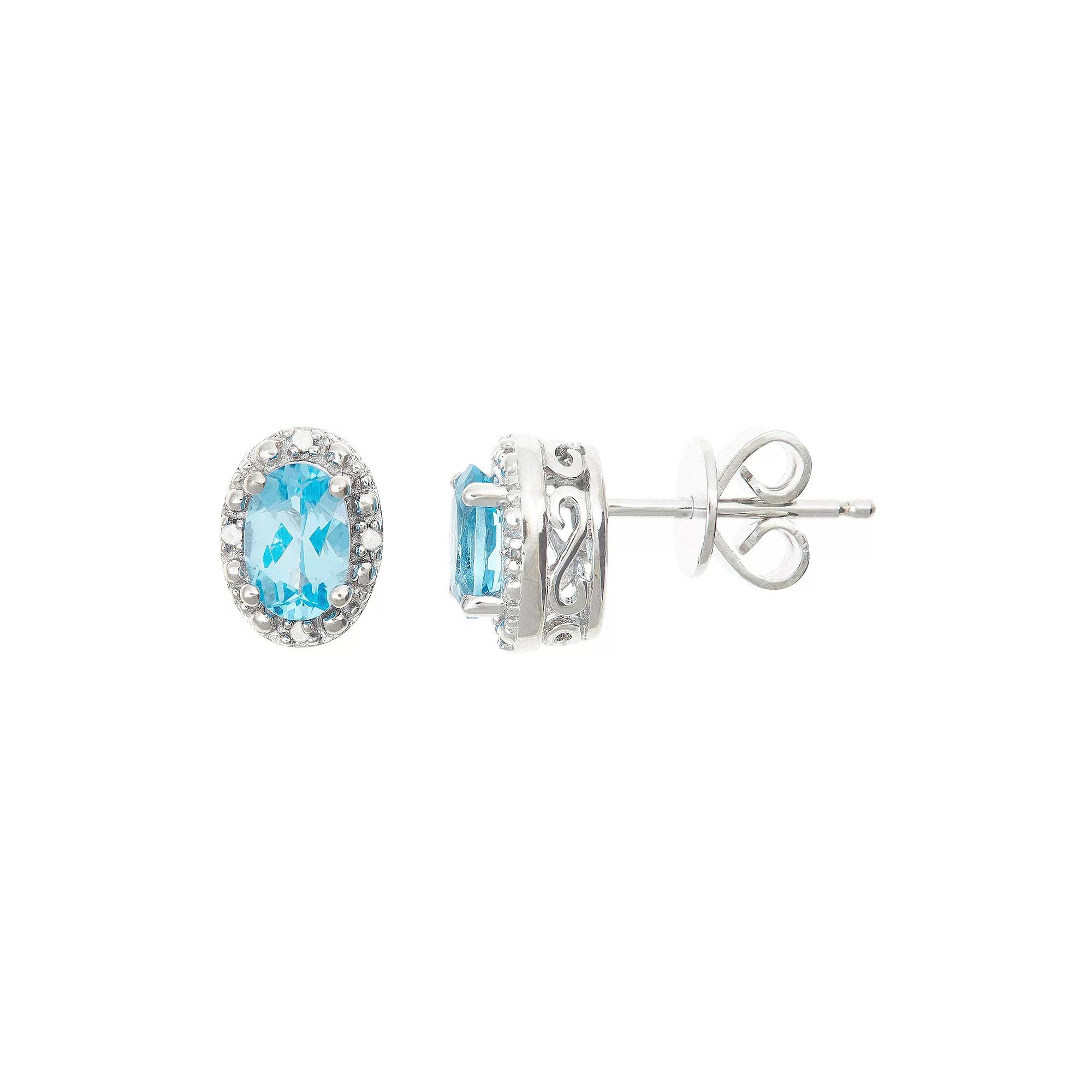 Add a timeless touch to your look with these captivating blue topaz and diamond accent halo earrings.EARRING DETAILSLength: 7 mmBackings: postMetal: sterling silverPackaging: boxedSTONE DETAILSStone type: blue topazTotal weight: 1 1/8 ct.Shape: ovalSetting: prongDIAMOND DETAILSTotal weight: less than 1/10 ct.Shape: single cutColor grade: I-JClarity: I2-I3Setting: prongGemstones may have been treated to enhance their appearance. Special care may be required. Please visit our Gemstone Treatment & Special Care Guide for more information. Image(s) may be enlarged to show detail.Diamond weights are approximate. Diamond total weights may vary between .01 and .08 ct. Some diamonds have fewer than 17 facets. Size: One Size. Gender: female. Age Group: adult.