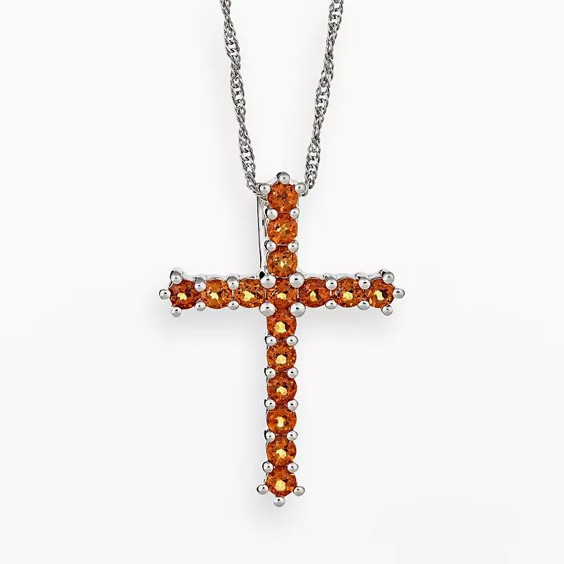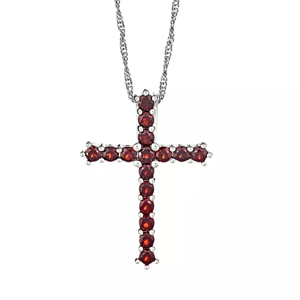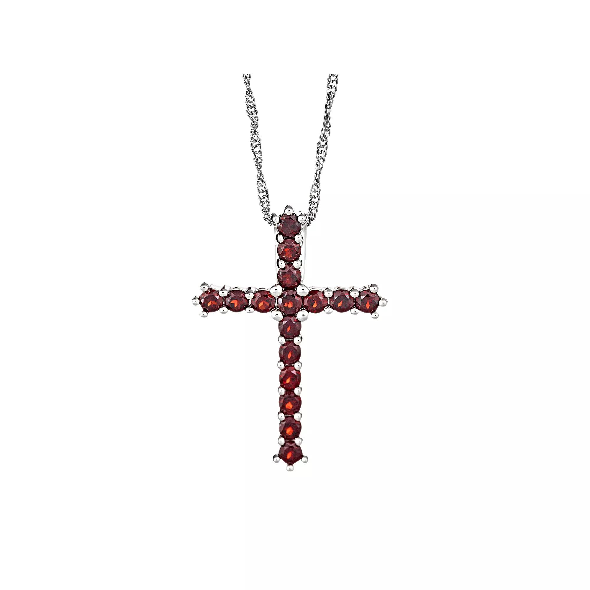 Genuine garnet stones adorn this beautiful cross pendant, making it a piece you'll always treasure. Genuine garnet stones adorn this beautiful cross pendant, making it a piece you'll always treasure. Pendant Details: Pendant length: 1.25 in. Chain length: 18 in. Clasp: lobster-claw Metal: rhodium-plated sterling silverStone Details: Stone type: genuine garnet Cut: round Setting: prong Size: 18". Color: Red. Gender: female. Age Group: adult.