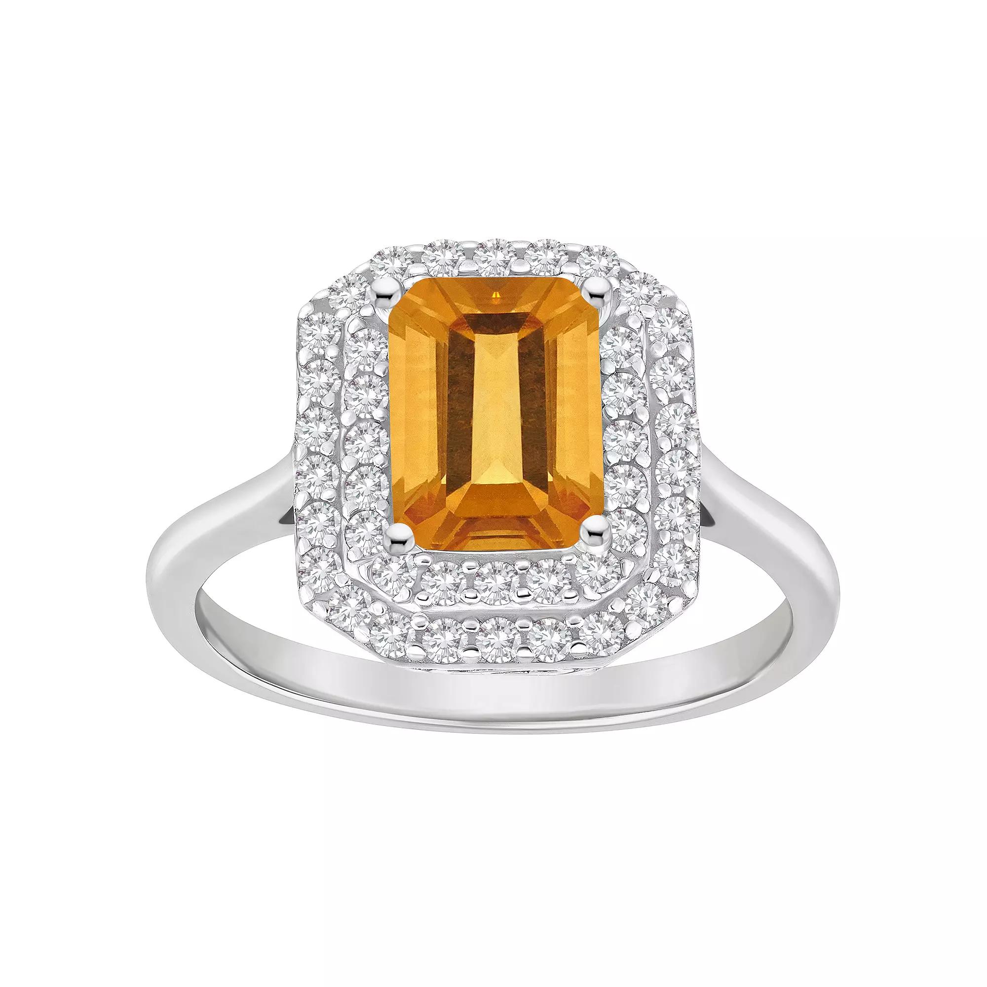 Crafted with sterling silver, this citrine and white topaz double halo ring offers an elegant look youll love. Crafted with sterling silver, this citrine and white topaz double halo ring offers an elegant look youll love.Click on this JEWELRY & WATCHES GUIDE to learn about fit, styles, materials and more! Nickel free Metal: sterling silver Packaging: boxed Plating: rhodium Width: 0.44 in. Finish: polishedSTONE DETAILS Stone type: citrine, white topaz Center stone weight: 1 5/8 ct. Total weight: 2 ct. Size: 8 mm x 6 mm Shape: emerald cut, round cut Setting: pave, prong Gemstones may have been treated to enhance their appearance. Special care may be required. Please visit our Gemstone Treatment & Special Care Guide for more information. Please note, due to the high value of this item, a signature may be required upon delivery. Color: Orange. Gender: female. Age Group: adult.