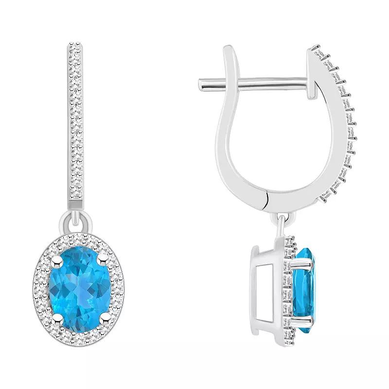 Crafted with sterling silver, these blue topaz and diamond hoop drop earrings offer an elegant look you'll love. Crafted with sterling silver, these blue topaz and diamond hoop drop earrings offer an elegant look you'll love. Nickel free Metal: sterling silver Backings: click-it Packaging: boxed Plating: rhodium Finish: polished Length: 0.38 in.STONE DETAILS Stone type: Swiss blue topaz Center stone weight: 2 ct. Total weight: 2 1/3 ct. Size: 7 mm x 5 mm Shape: oval cut Setting: prongDIAMOND DETAILS Total weight: 1/3 ct. Color grade: H-I Clarity: 12-13 Shape: round Setting: prong Diamond weights are approximate. Diamond Total Weights may vary between .01 and .13 ct. Some diamonds consist of fewer than 17 facets. Gemstones may have been treated to enhance their appearance. Special care may be required. Please visit our Gemstone Treatment & Special Care Guide for more information. Image(s) may be enlarged to show detail. Please note, due to the high value of this item, a signature may be required upon delivery. Size: One Size. Gender: female. Age Group: adult.