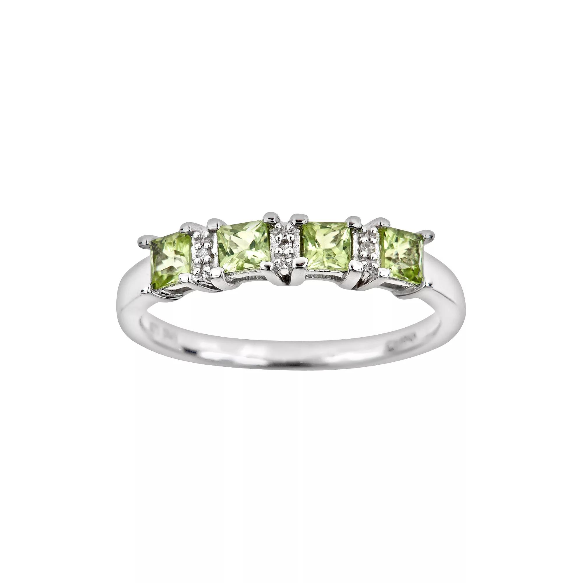 Magnificent princess-cut peridot stones and diamond accents make this sterling silver ring an eye-catching addition to any outfit. Click on this JEWELRY & WATCHES GUIDE to learn about fit, styles, materials and more!Ring Details: Width: .12-in. Metal: rhodium-plated sterling silver Gemstone Details: Gemstone type: genuine peridot Cut: princess Setting: prong Diamond Details: Carat total weight:less than.1 Cut: round Color: G-H Clarity: I1-I2 Setting: pave Image(s) may be enlarged to show detail. Diamond weights are approximate. Diamond total weights may vary between .01 and .08 ct. Some diamonds have fewer than 17 facets. Gemstones may have been treated to enhance their appearance. Special care may be required. Please visit our Gemstone Treatment & Special Care Guide for more information. Size: 5. Color: Green. Gender: female. Age Group: adult.
