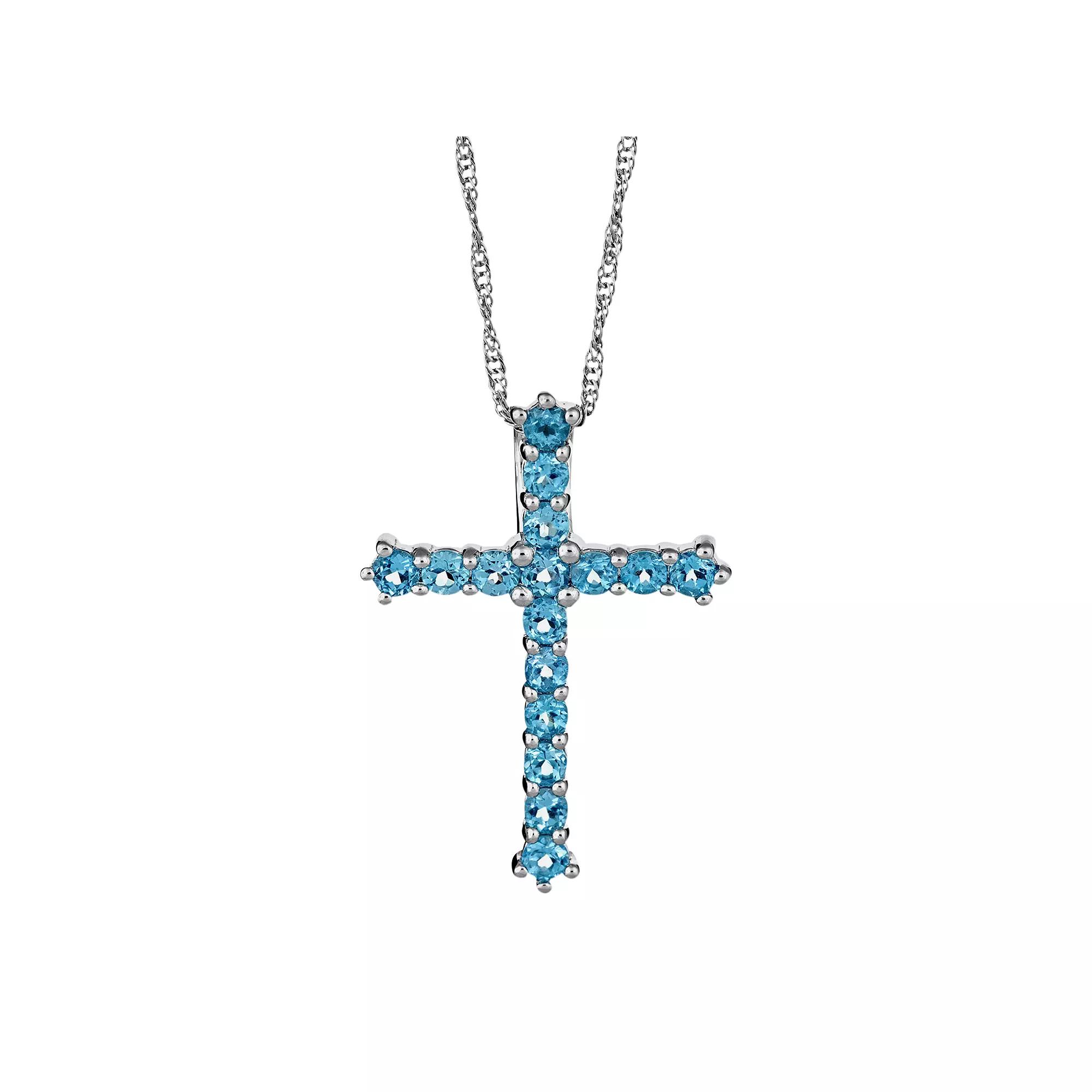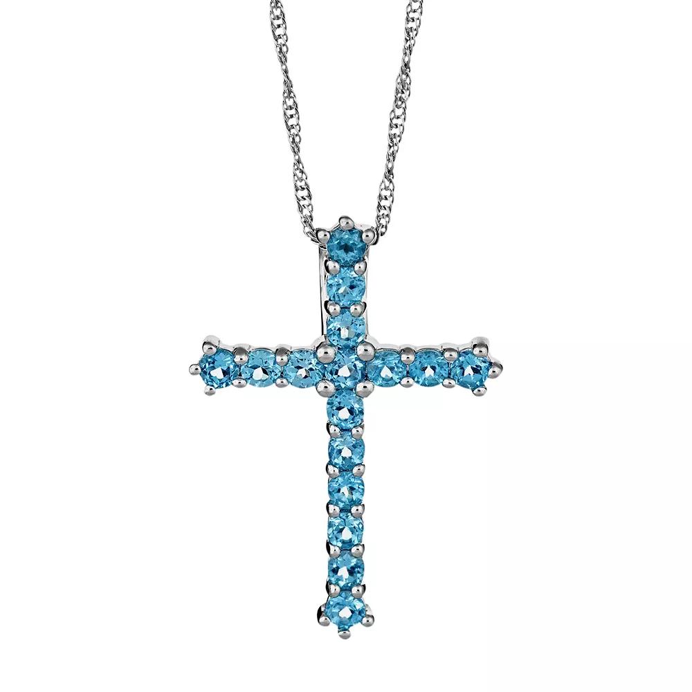 This beautiful cross pendant will be a divine addition to any ensemble. Pendant Details: Pendant length: 1.25 in. Chain length: 18 in. Clasp: lobster-claw Metal: rhodium-plated sterling silverStone Details: Stone type: genuine Swiss blue topaz Cut: round Setting: prong Size: 18". Gender: female. Age Group: adult.