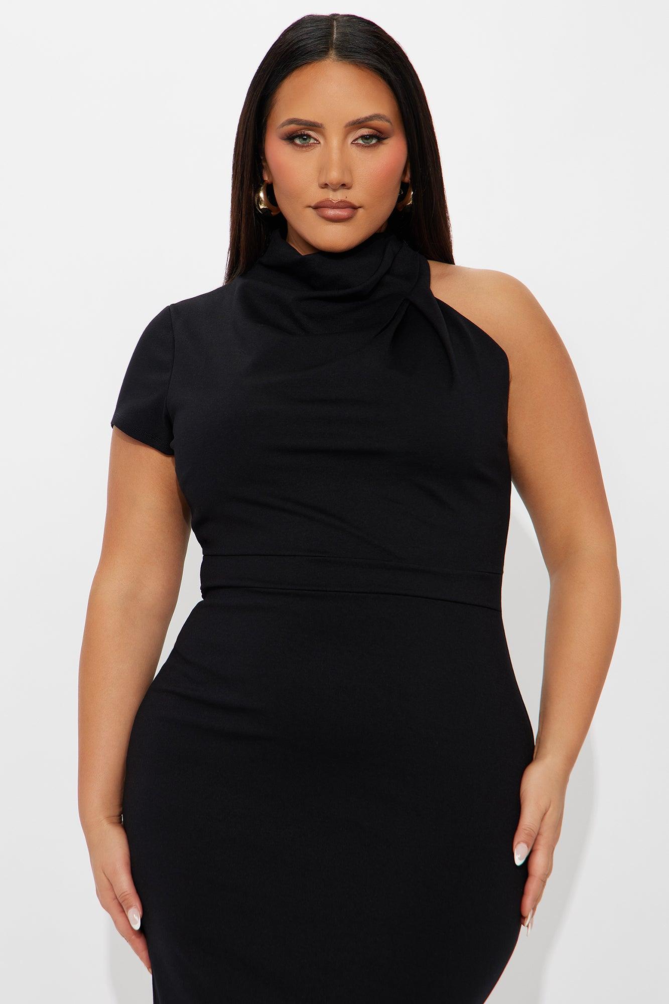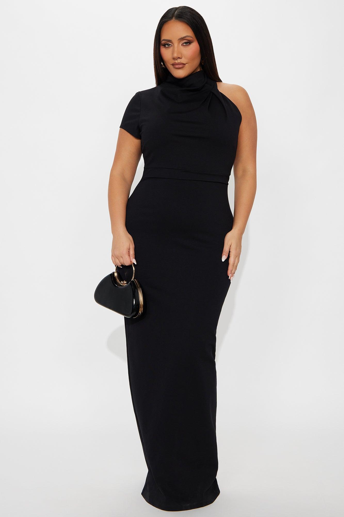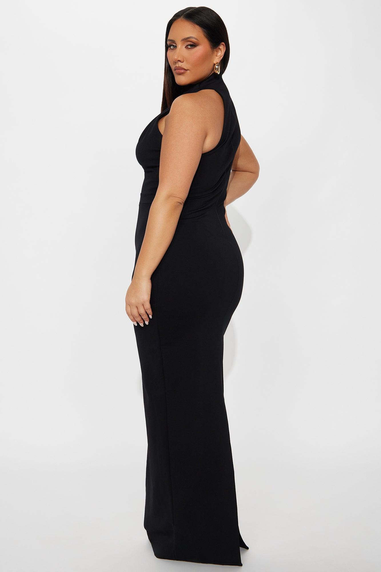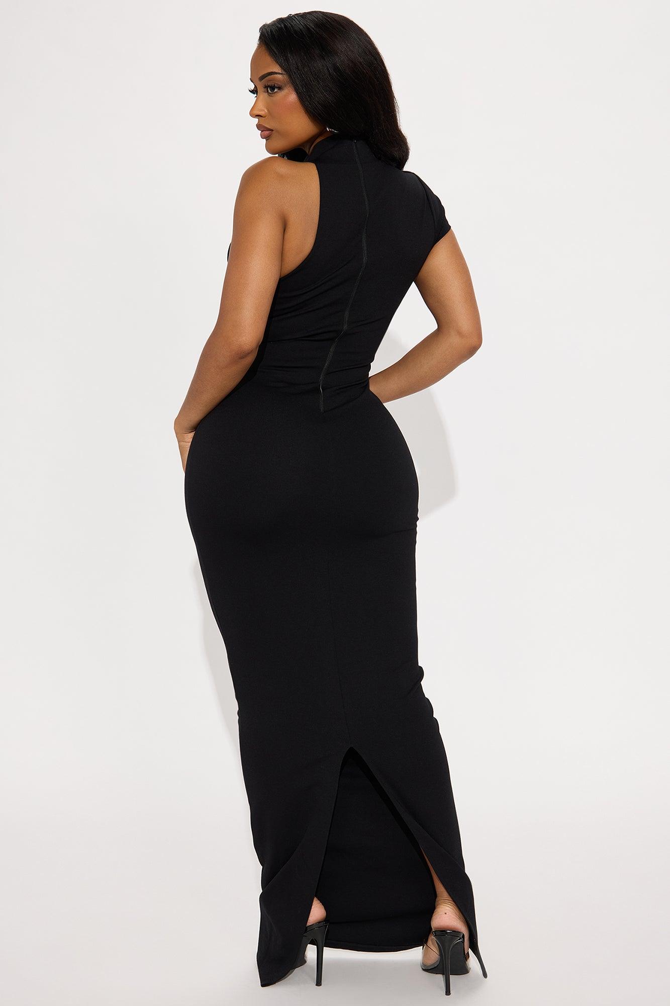 Available In Black And White. Ponte Body Sculpting Maxi Dress Mock Neck One Short Sleeve Ruched Hidden Back Zipper Back Slit Chest Lined Stretch Self: 62% Viscose 33% Nylon 5% Spandex Lining : 100% Polyester Imported California Proposition 65WARNING: Cancer and Reproductive Harm - www.P65Warnings.ca.gov.