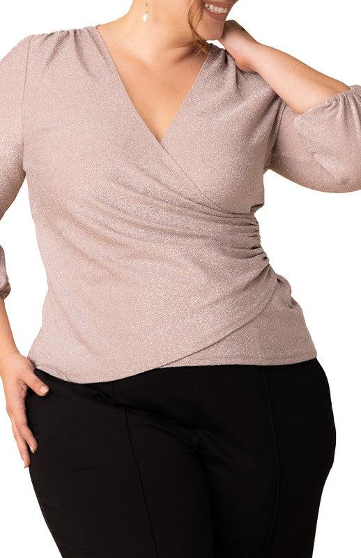 Make an unforgettable entrance in the Plus Size Celeste Faux Wrap Top, a dazzling choice for any special occasion. This sparkly blouse features a flattering surplice neckline, elegant lantern sleeves with elastic cuffs, and subtle shirring at the left side seam for a curve-enhancing fit.