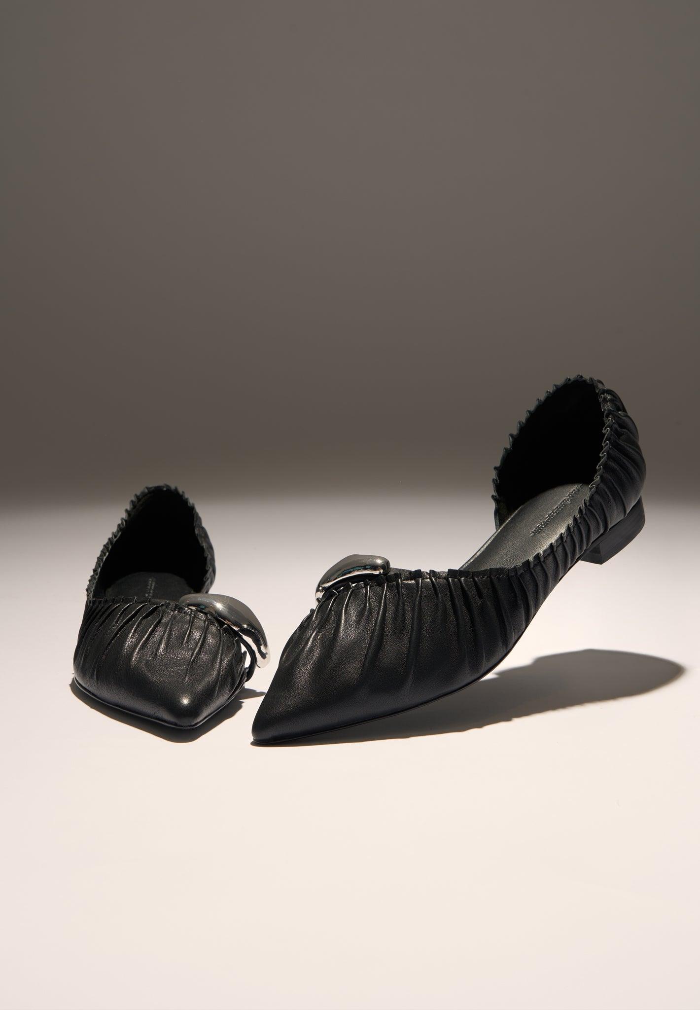 The Céleste Leather Flats blend timeless elegance with modern detailing, crafted from supple nappa leather, they feature a sleek pointed toe, gathered material effect, and refined metal hardware. A versatile statement piece that seamlessly elevates any look. Pointed flats with a sleek, structured silhouette Gathered material effect adds subtle texture Metal hardware feature for an elevated finish Genuine nappa leather for a soft, premium feel Debossed Manière De Voir Eiffel on the sole for signature detailing 100% Nappa Leather / 100% PolyesterAlways check the care label for wash instructions.