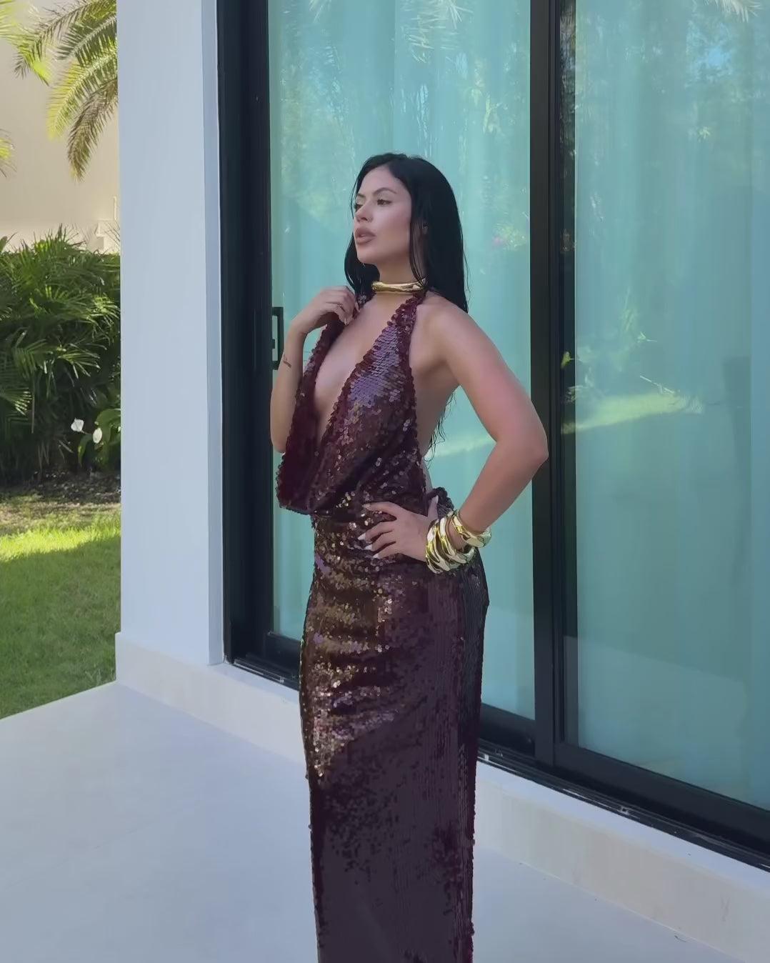 Available In Burgundy. Sequin Maxi Dress Halter Deep V- Neckline Backless Drape Hidden Size Zipper Closure Lined Stretch Self/Lining: 100%Polyester Imported