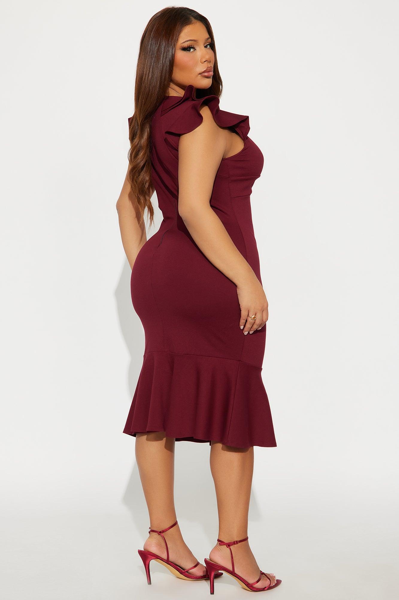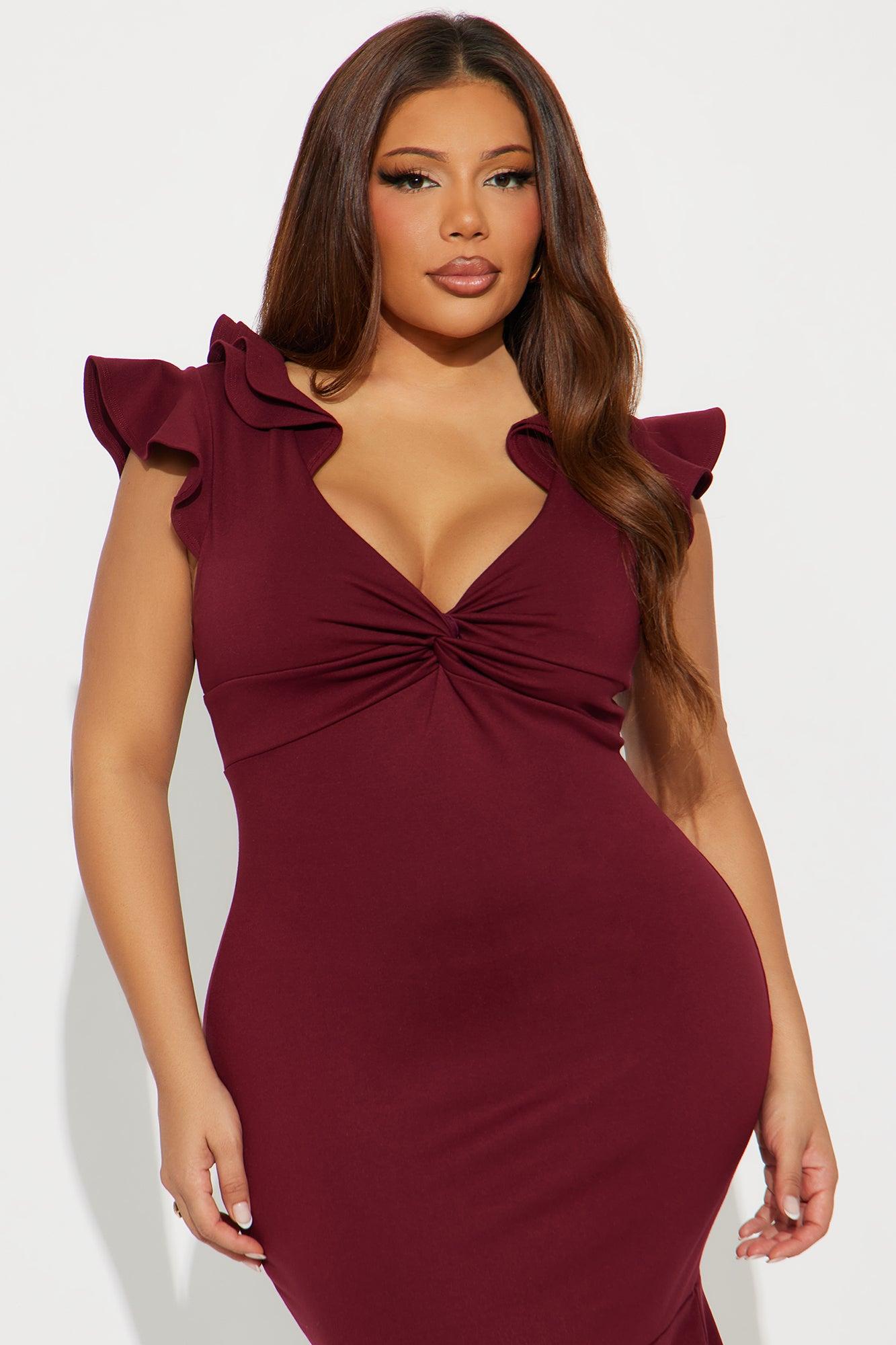 Available In Black, Burgundy And White. Ponte Midi Dress Deep V-Neckline Short Ruffle Sleeve Twist Detail Peplum Back Zipper Lined Length Measured Flat = 41" Self: 62% Viscose 33% Nylon 5% Spandex Lining: 100% Polyester Imported California Proposition 65WARNING: Cancer and Reproductive Harm - www.P65Warnings.ca.gov.