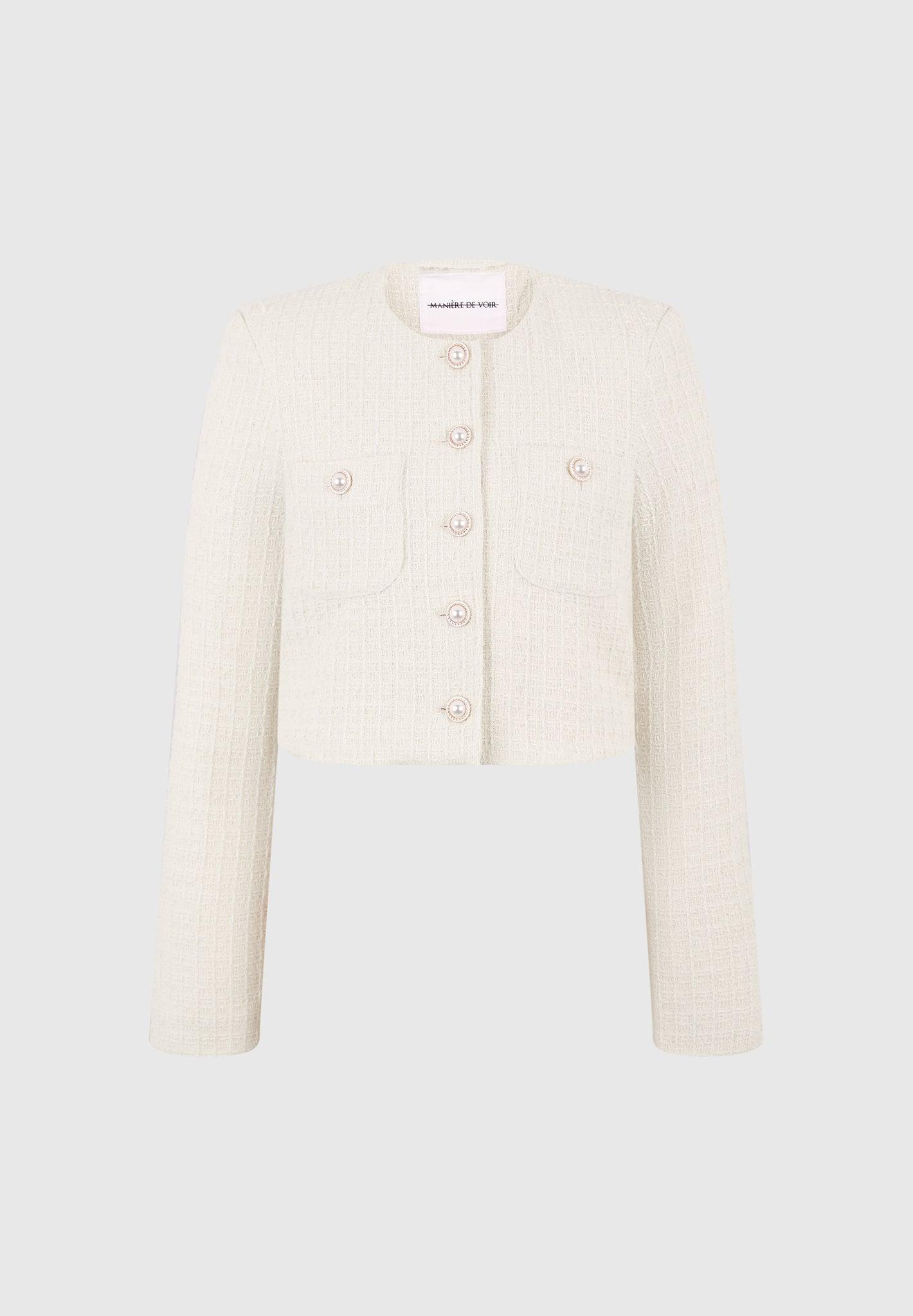 This jacket is designed with a cropped, fitted, and tailored silhouette. Its classic design exudes sophistication and style, making it a versatile piece for any occasion. Expertly crafted with tweed and pearl accents, this jacket offers an elegant and refined touch to your wardrobe. Cropped Jacket Silhouette Tailored Fit Front Pockets Pearl Button Fastening Crew Neckline Long Sleeve Tonal Manière De Voir Eiffel Zip 100% PolyesterAlways check the care label for wash instructions.