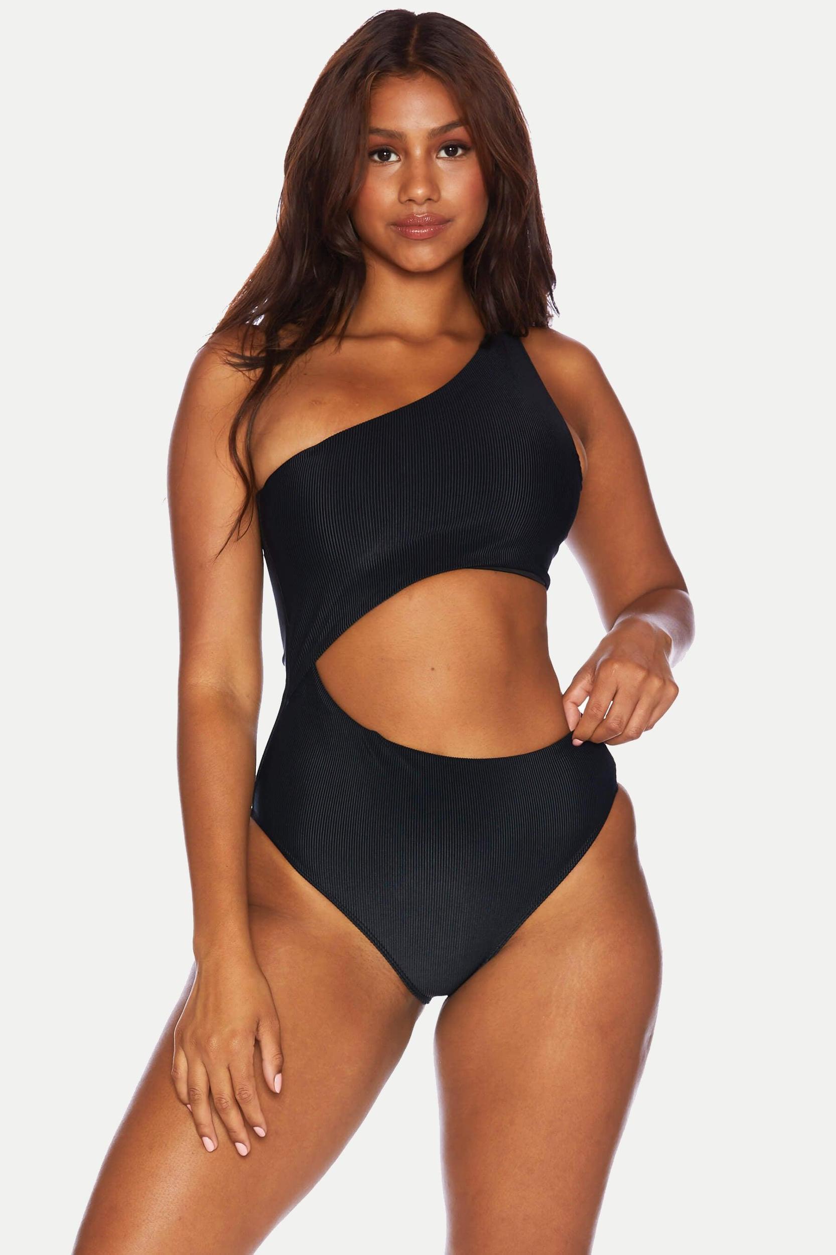 Details A crowd favorite, the Celine in Black is an asymmetrical one piece swimsuit with side cutouts and moderate coverage. Chic and new, she has become one of our bestsellers. Perfect for any activity, from lounging poolside to swimming in the ocean. Moderate Coverage Poly/Spandex blend Hand wash cold; lay flat to dry Made in the USA Models wearing Size Small, Medium and Large
