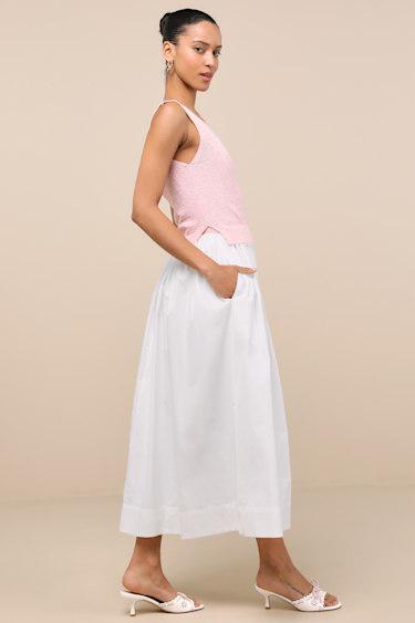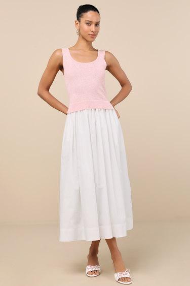 We suggest pairing this mixed media midi dress with a bouquet of farmers market flowers for the ultimate spring look. Lightweight sweater knit shapes the sleeveless bodice with a scoop neckline and an overlaying waist with side notches. The woven poplin skirt features a classic A-line silhouette with side seam pockets for a darling touch.