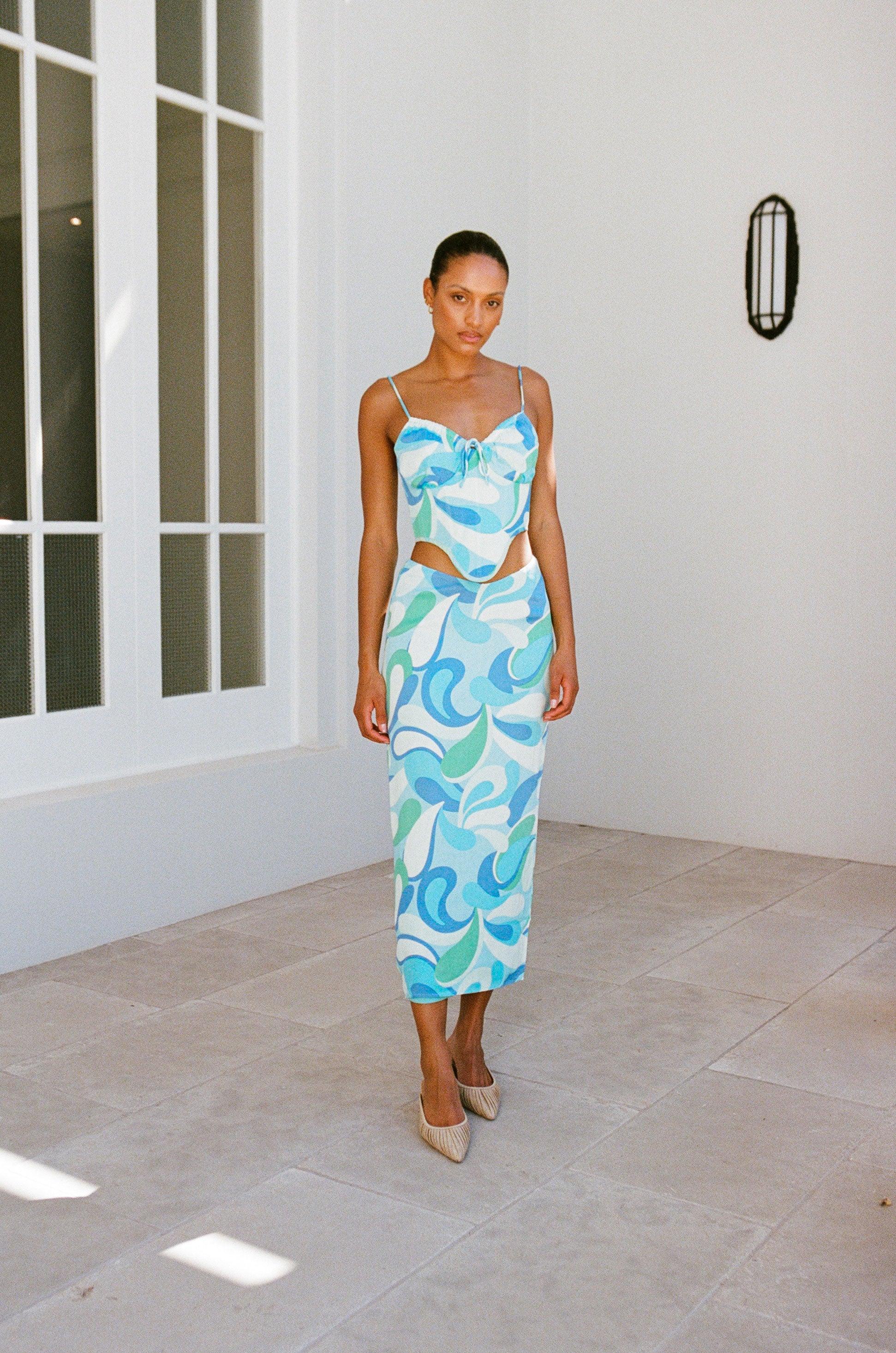 *THIS IS A FINAL SALE ITEM and cannot be returned. See our Returns Policy here Introducing our brand new exclusive swirl print! The Celyna Corset Top is made from a matte silky fabric and features rouleau straps, draw tie at centre bust, boning at bodice for added structural support and a curved asymmetric hem with bind detail. Style as a set with the Celyna Midi Skirt or Alanis Pants! Designed exclusively by Sabo.