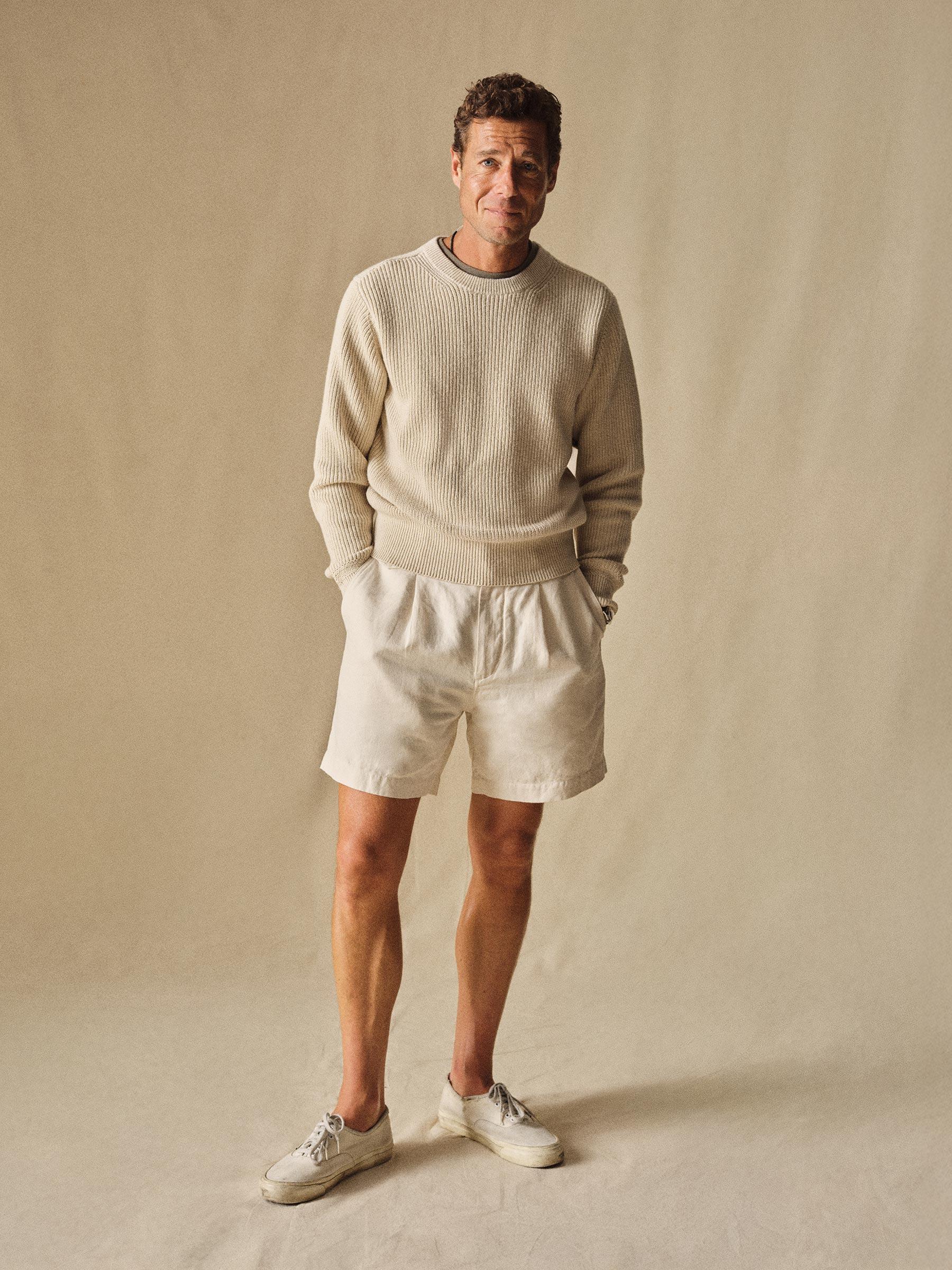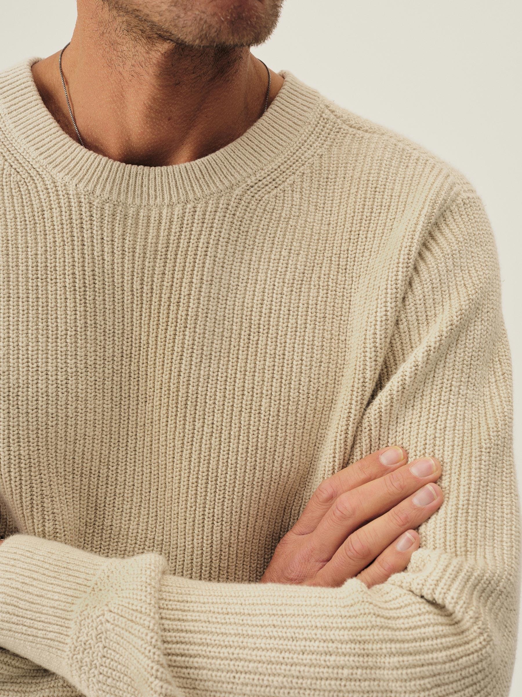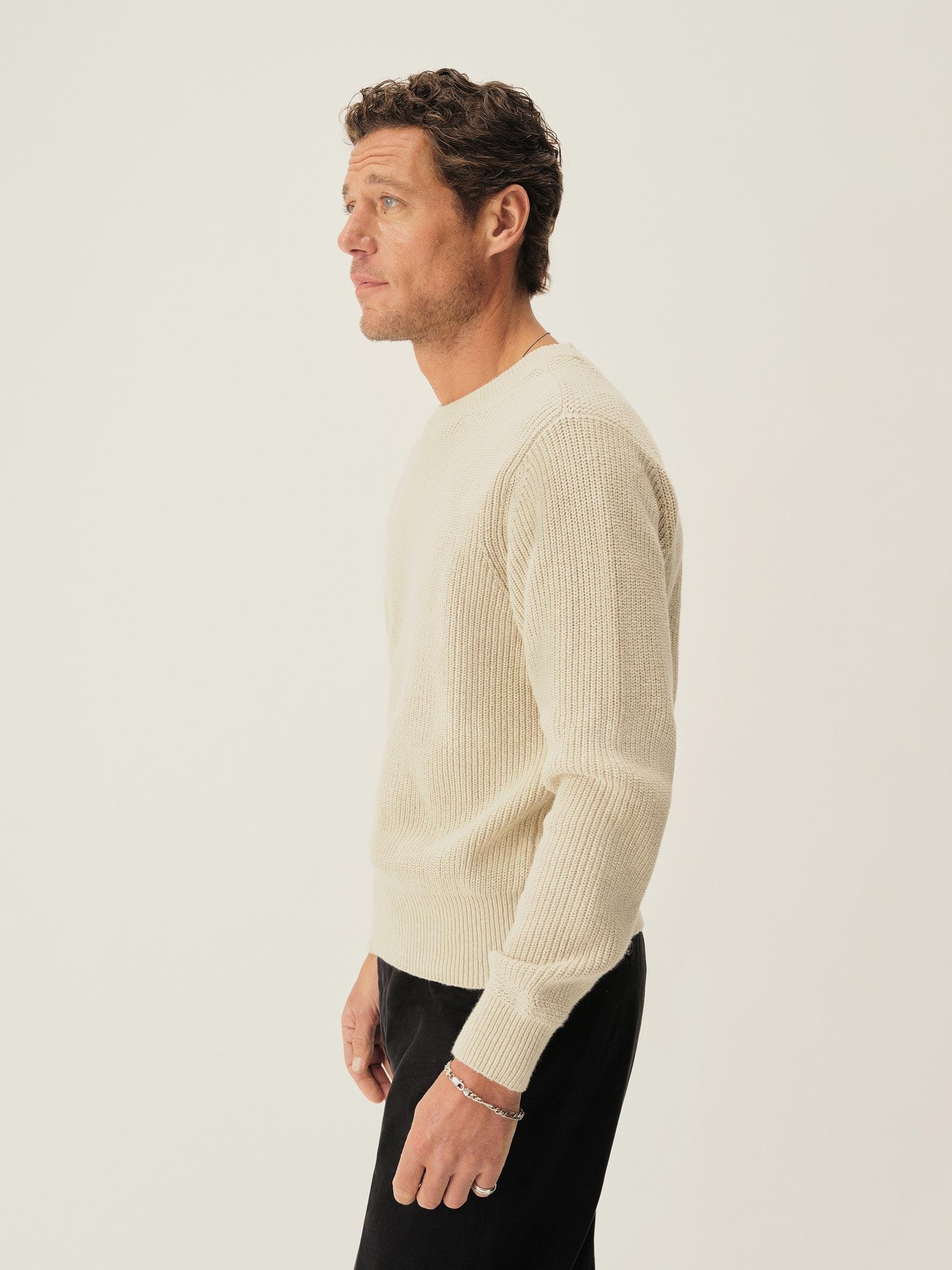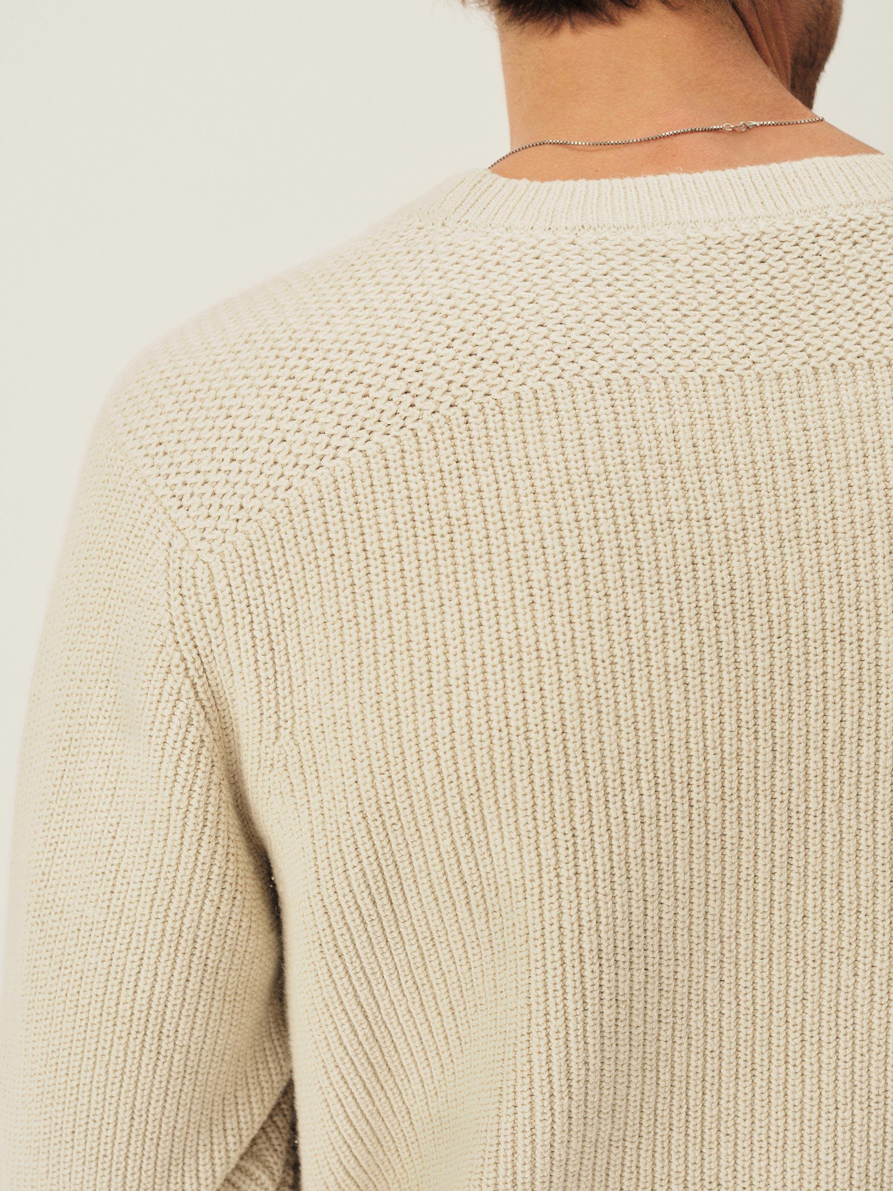 Jersey knit crewneck sweater in richly textured homespun cotton rib. Ideal for year-round wear.