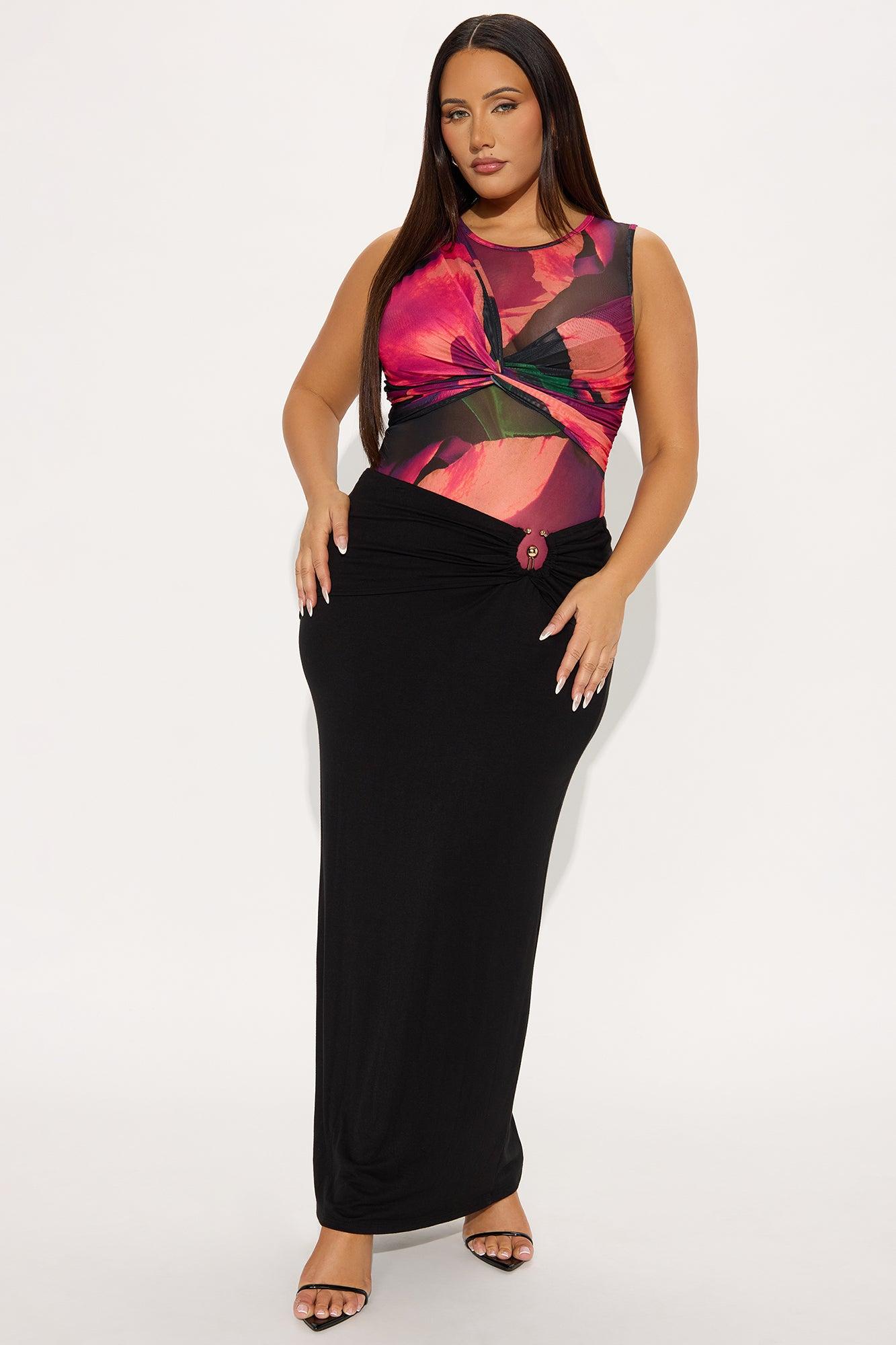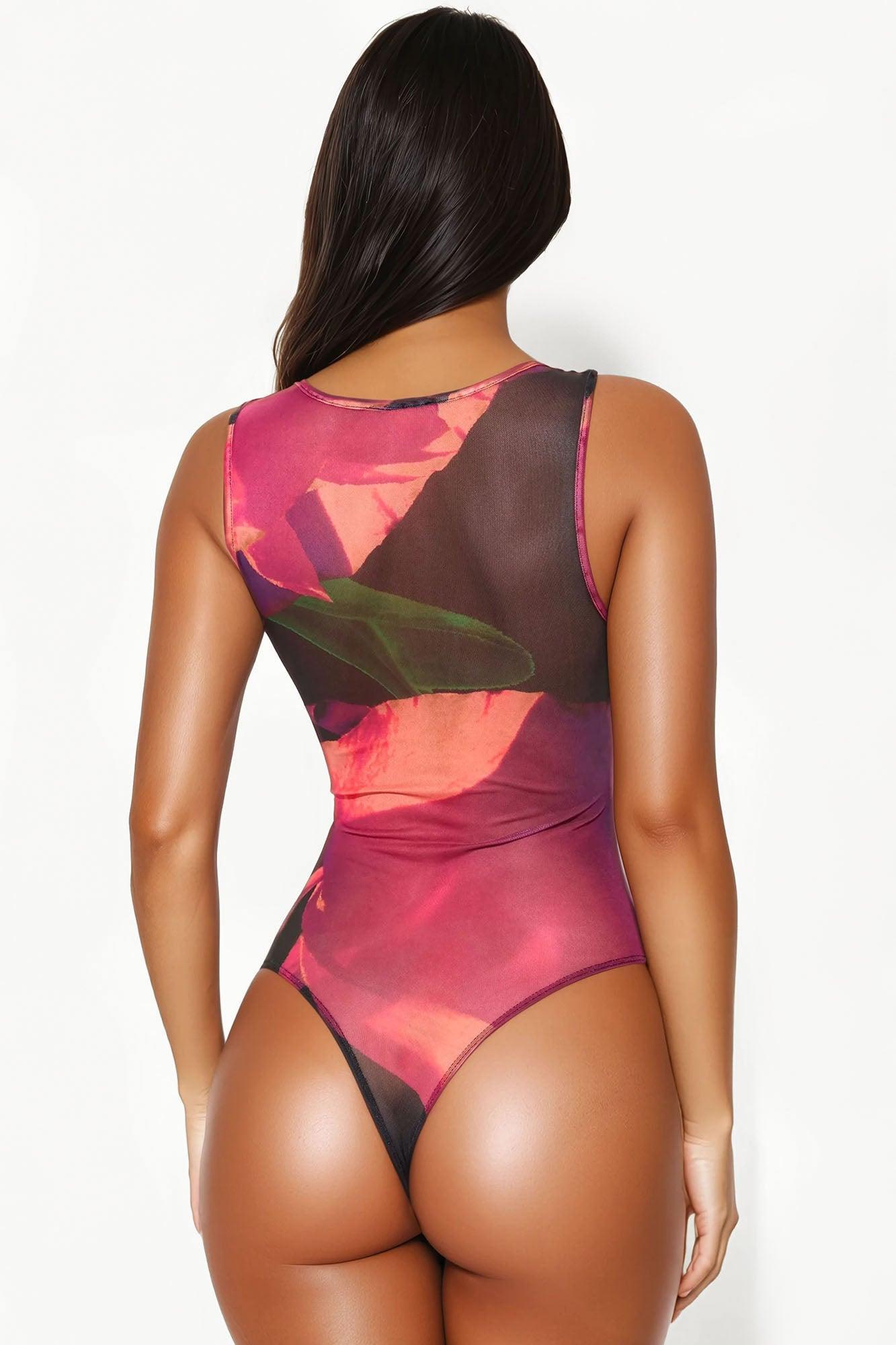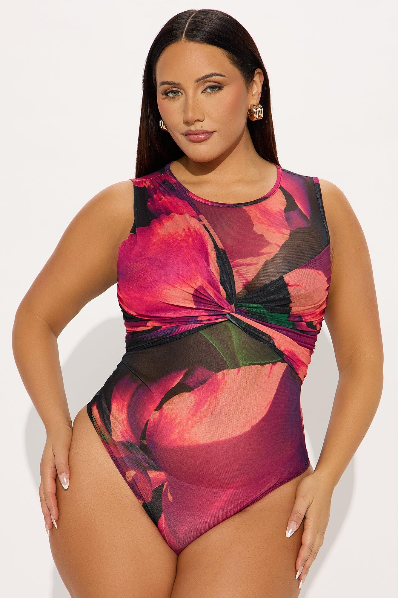 Available In Purple/combo. Mesh Bodysuit Stretch High Neck Sleevless Twist Detail Ruched Cheeky Bottom Snap Closure Self:95%Polyester 5%Spandex Imported California Proposition 65WARNING: Cancer and Reproductive Harm - www.P65Warnings.ca.gov.