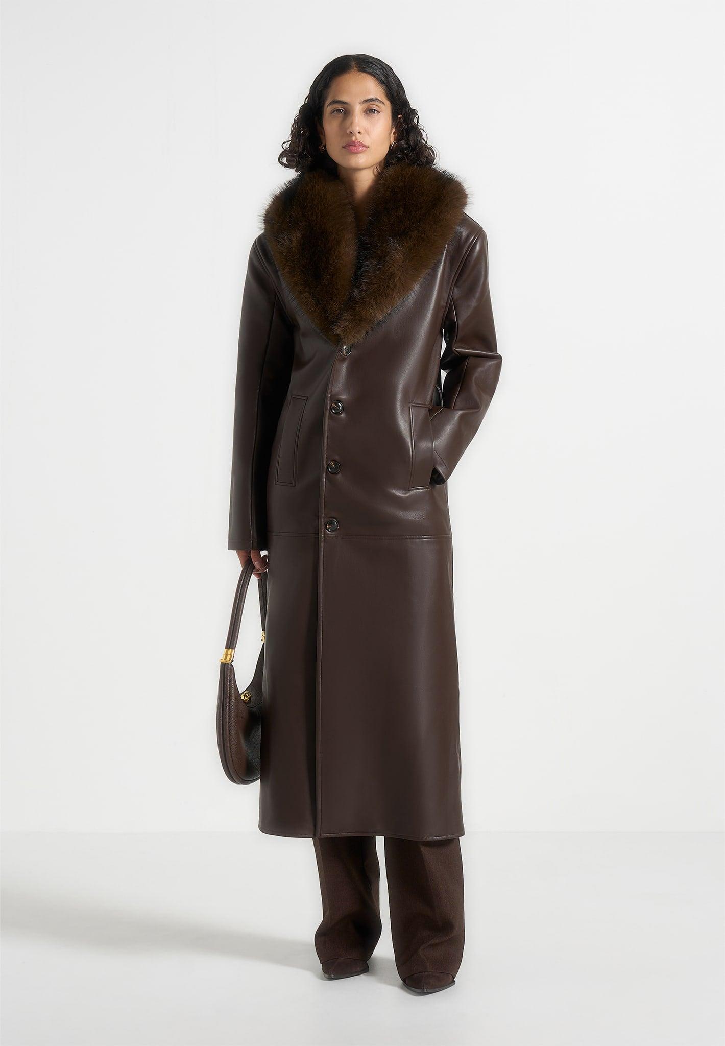 Cut in a timeless longline silhouette, this coat blends modern refinement with bold detailing. Crafted from vegan leather, it is defined by a contrast faux fur collar and finished with marble feature buttons for a striking touch. A detachable belt offers versatile waist definition, while functional front pockets ensure everyday practicality. Crafted from vegan leather for an elevated finish Contrast faux fur collar for a refined detail Longline coat silhouette for a timeless, elongated look Detachable belt for versatile styling and waist definition Functional front pockets for everyday practicality Marble feature buttons for a statement accent Tonal Manière De Voir vegan leather Eiffel patch to centre back