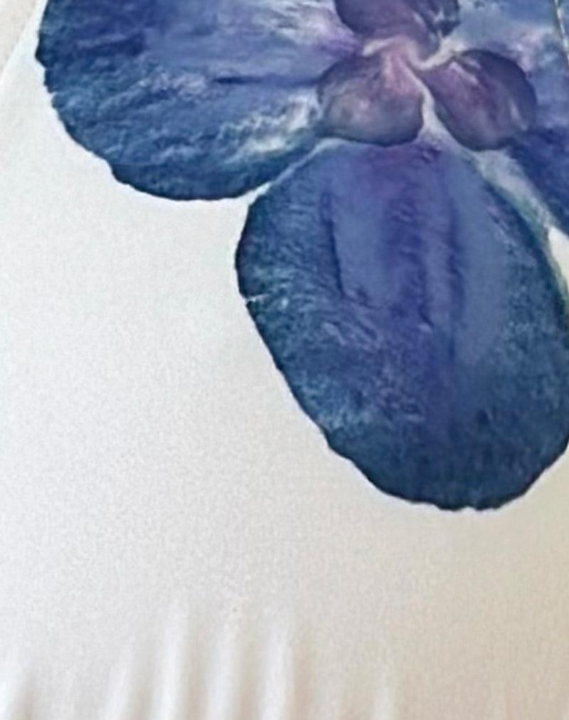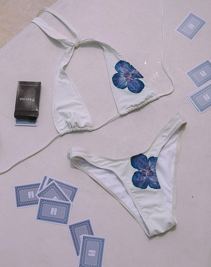 A wide triangle bikini top with thick halterneck straps and a single tie detail at the back with a placement blue orchid printed on the left cup, on an ivory swim spandex made from recycled materials. Pair with the matching Lentra bottoms. MODEL WEARS SIZE: EXTRA SMALL - MODEL HEIGHT:5'7