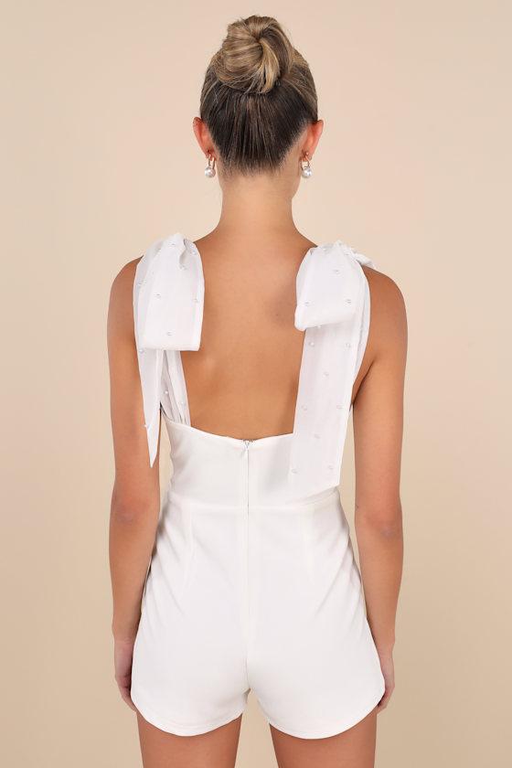 Everyone will be complimenting the way you shine in the Lulus Certainly Aglow White Organza Pearl Tie-Strap V-Neck Romper! Stretchy crepe knit shapes this ultra-cute romper that falls from tying, organza straps adorned with gleaming faux pearls. Princess-seamed bodice features a V-neckline and a fitted waist, all atop flirty shorts. Hidden back zipper/clasp. Pair to perfection with your most adorable heels!