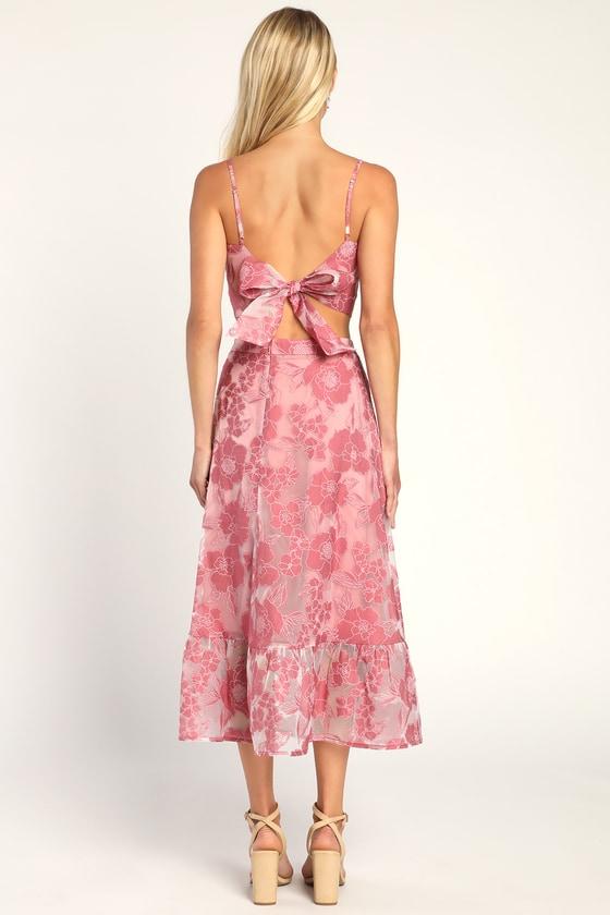From upscale brunches to impromptu soirees, the Lulus Certainly Stylish Mauve Pink Burnout Floral Two-Piece Midi Dress brings the fashion! Sheer woven fabric, with a burnout jacquard mauve pink floral pattern, shapes a fitted crop top with a sweetheart neckline, adjustable straps, and long sashes that tie at back. Matching midi skirt begins with a high banded waist and falls to a tiered hem. Hidden back zipper/clasp.
