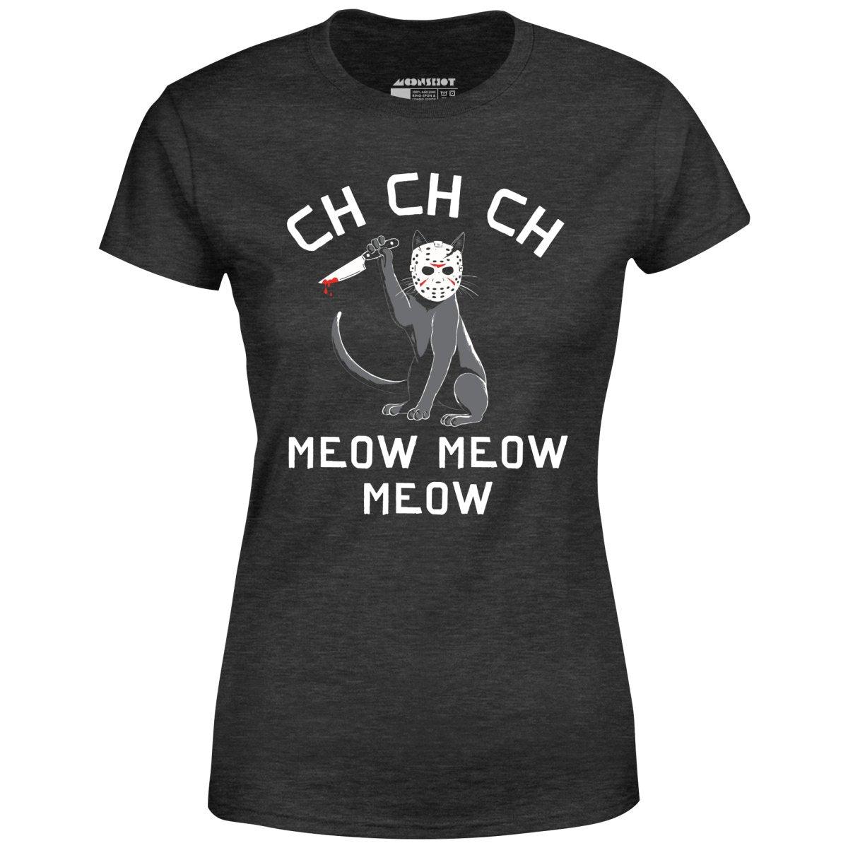 Ch Ch Ch Meow Meow Meow. A funny cat inspired Halloween horror movie design. Printed on our super soft 100% ringspun & combed cotton women's T-Shirt. Or upgrade to our Luxury 52/48 cotton/poly vintage heather edition for an even softer classic look. We print & ship all of our high quality graphic tees in the USA.