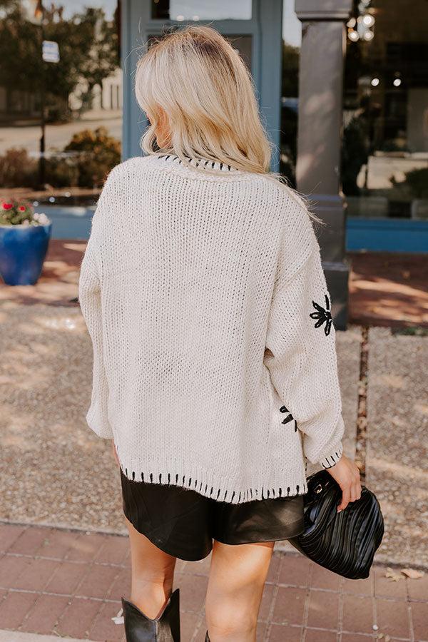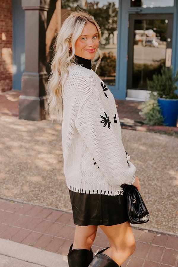 - This adorable piece will have you ready for cozy season! Its trendy trim and adorable floral pattern add the perfect touch of charm to any casual outfit. Whether you're strolling around the square or meeting up for brunch, this cutie will keep you looking stylish! - Unlined knit material - Black colored embroidered accent trim - A floral design knit onto the front - Long sleeves - An open draped silhouette that ends in a straight hemline