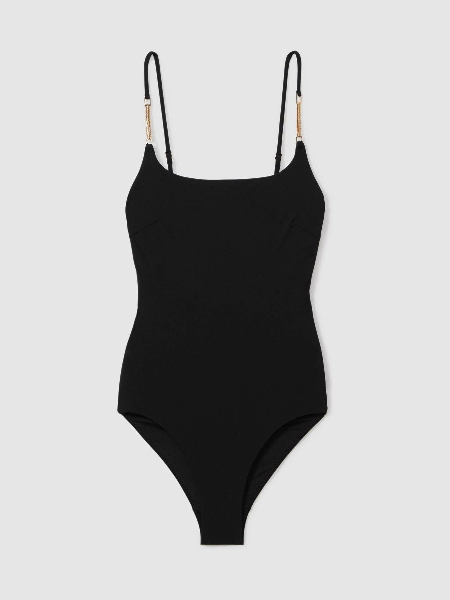 The Imogen swimsuit skims the body, complete with gold-tone herringbone chains to the adjustable shoulder straps. An internal underwired bra is added for a secure fit around the bust. Adjustable shoulder straps. Gold-tone herringbone chain to straps Internal underwired bra. Clasp closure to reverse. Cut-out detail to reverse.