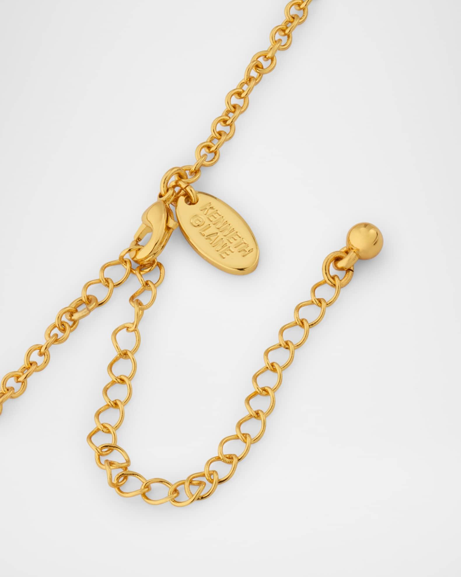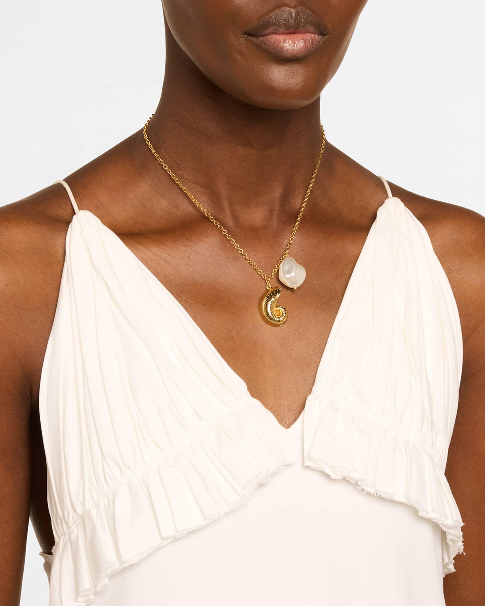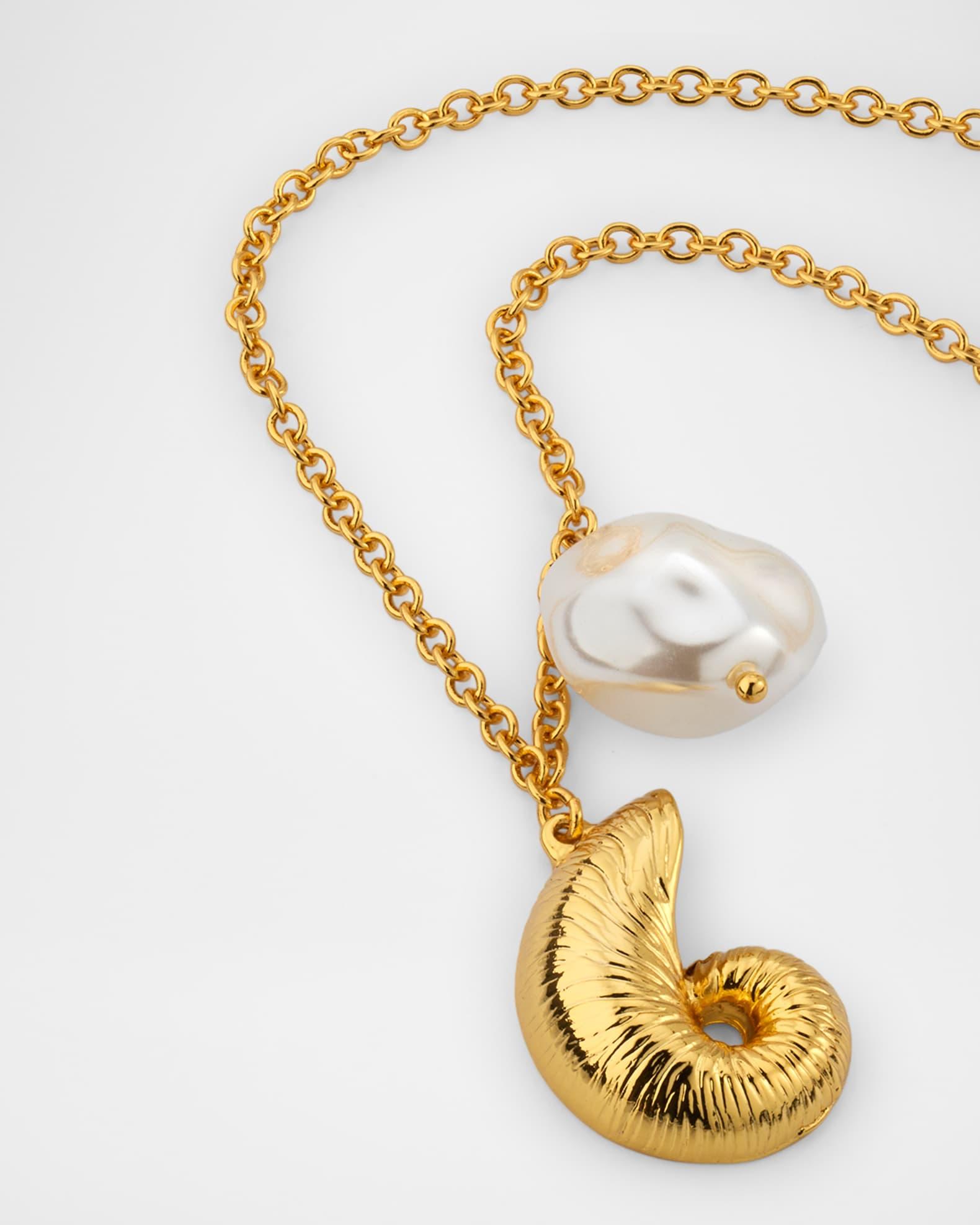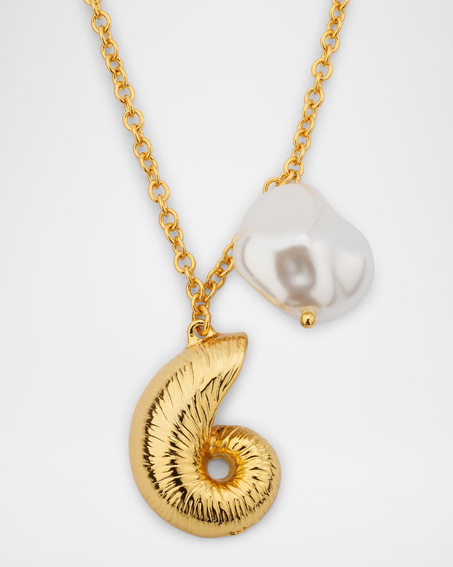 Kenneth Jay Lane necklace is strung with a spiral shell pendant and a white dyed freshwater cultured pearl Approx. 16-20" length; 1" pendant Gold-tone brass Adjustable length Lobster clasp Spot clean Imported