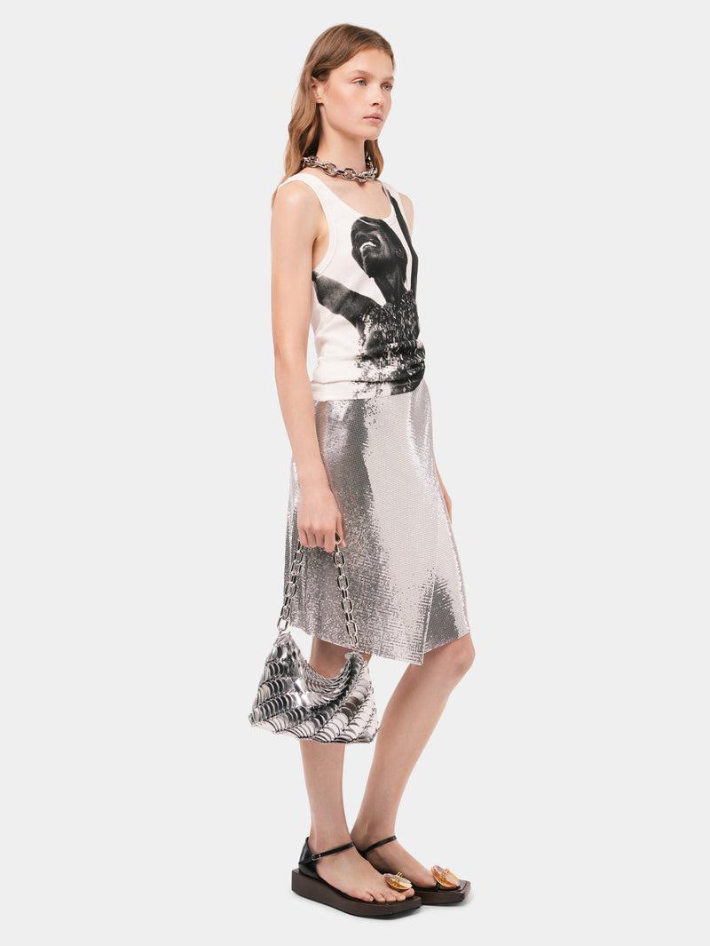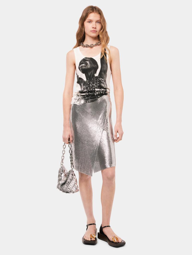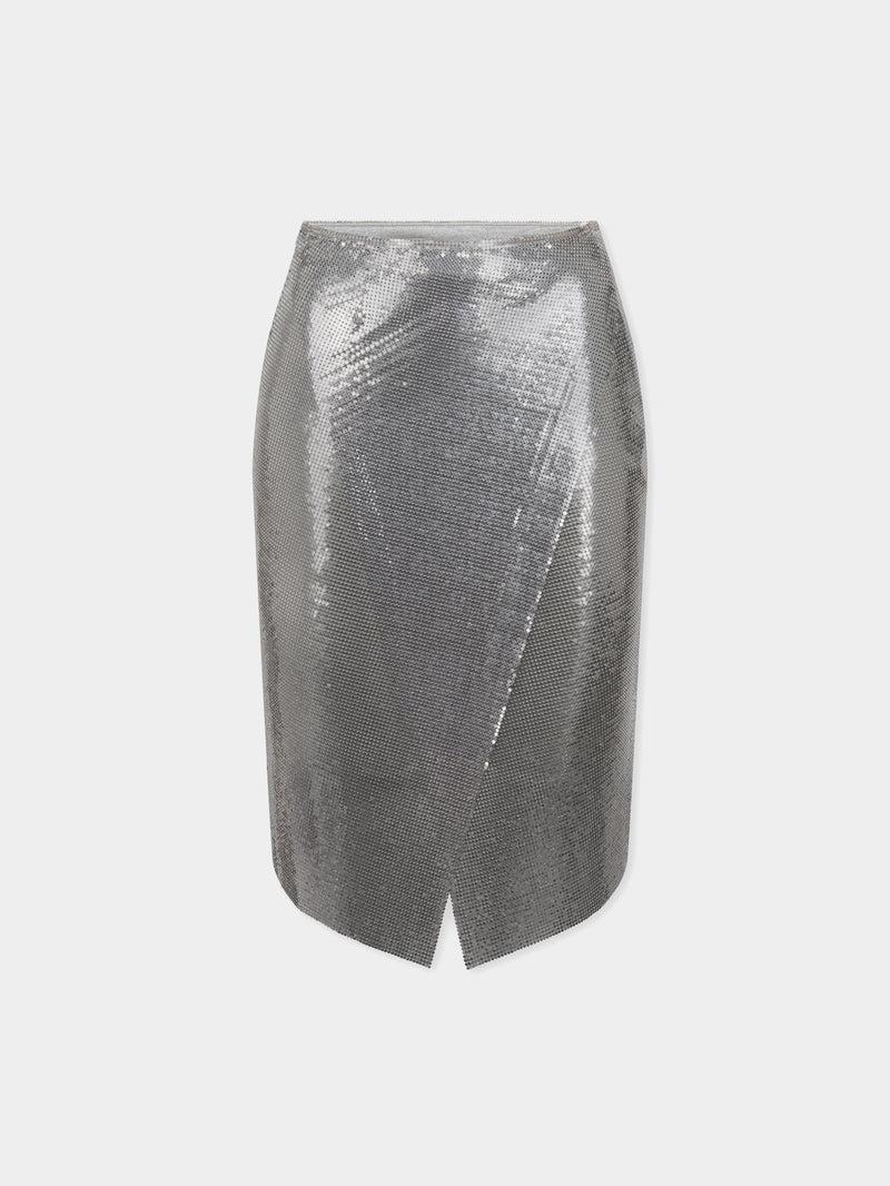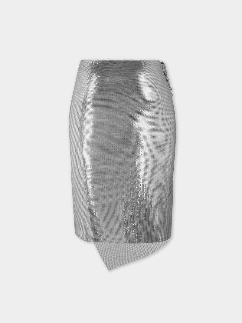 Crafted entirely from mesh, an iconic Maison Rabanne material, this mid-length, silver draped skirt is an elegant and timeless piece made bold and modern thanks to Maison Rabanne's DNA. Side snaps engraved with the Paco Rabanne logo