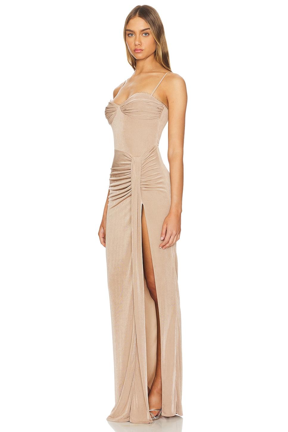 Self: 95% polyester, 5% spandexLining: 100% polyester. Made in USA. Dry clean only. Fully lined. Hidden back zipper closure. Adjustable shoulder straps. High front slit. Revolve Style No. KATR-WD466. Manufacturer Style No. GKAH0580.