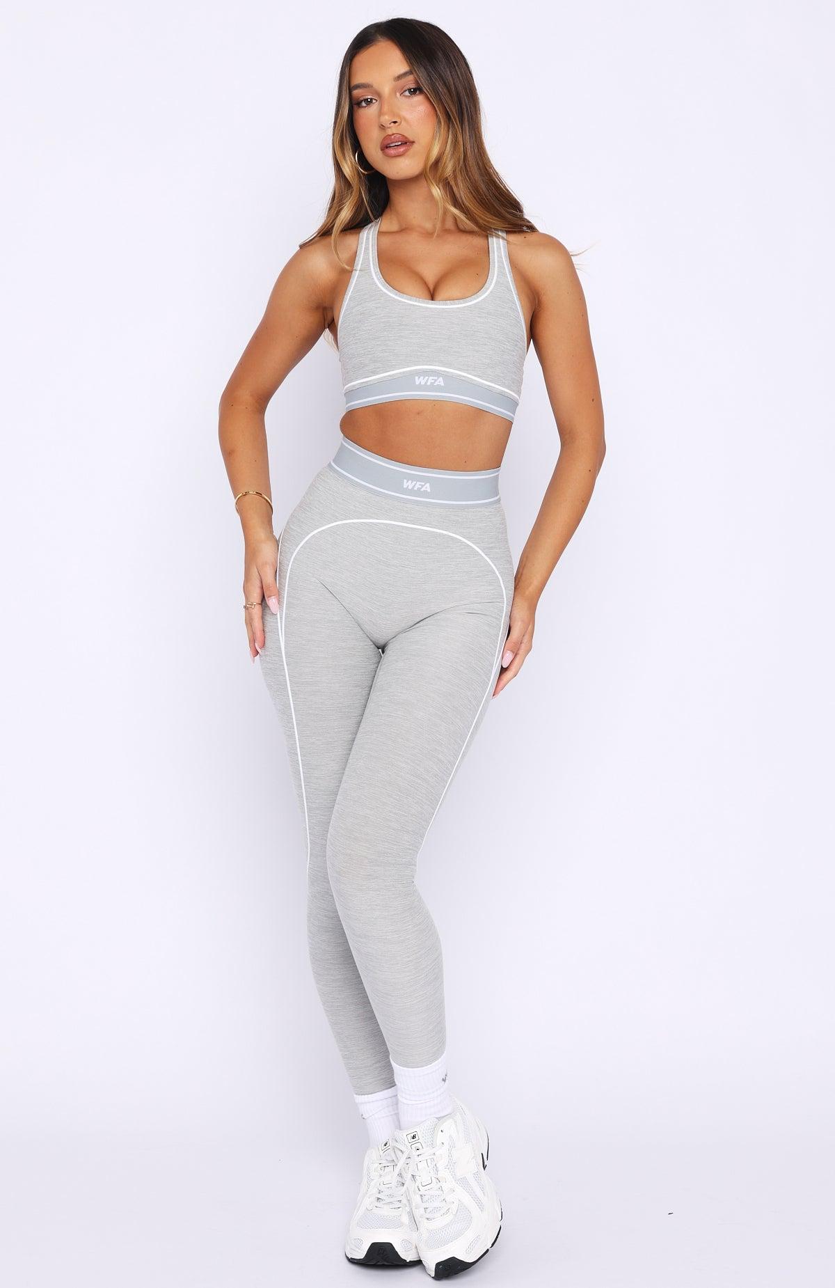 WHITE FOX ACTIVE My kind of addiction. The Challenge Leggings in Grey Marle feature a thick elastic waistband with WFA initials at the centre front, piped detailing along the front and down the leg, and a high-stretch, unlined fabric for a sleek, fitted feel. Style them with the matching Strategy Sports Bra and your favourite sneakers.