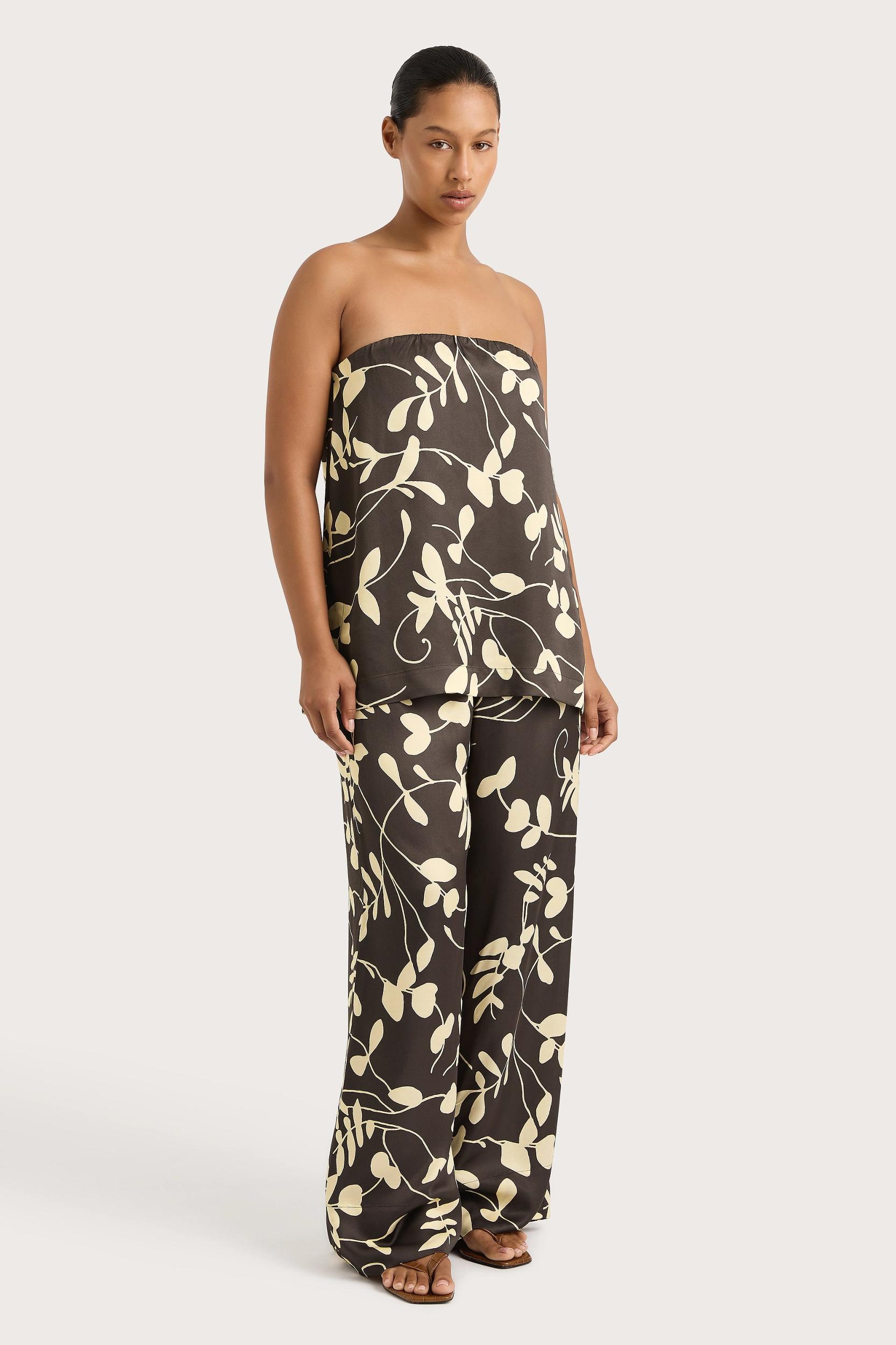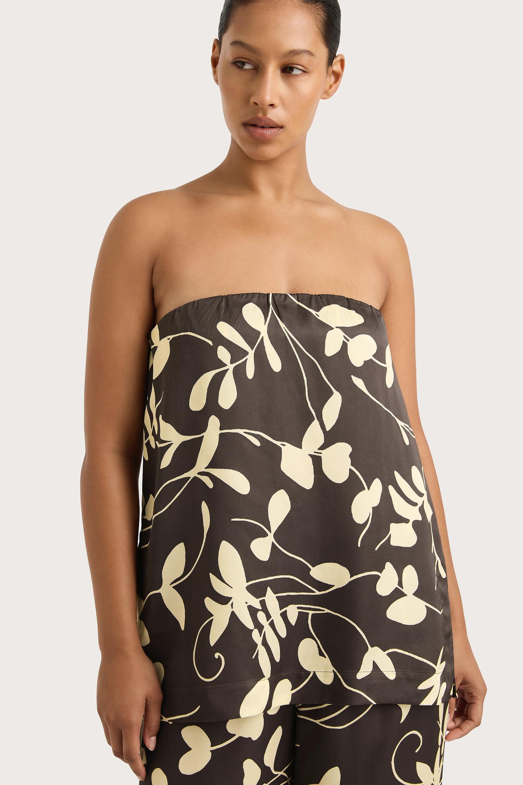 A strapless top, designed from an ultra-soft and luxurious blend of viscose and rayon in a deep chocolate brown colourway with a vintage-inspired floral motif, inspired by wallpapers from the 1920s. It is elasticated across the top with a shirred underbodice, while the top falls as a loose overlay, cropping around the hips. Style with the Chambien Pant for effortless day to night occasionwear. This style is true to size. Please note additional stretch is offered through the elasticated top and shirred underbodice.