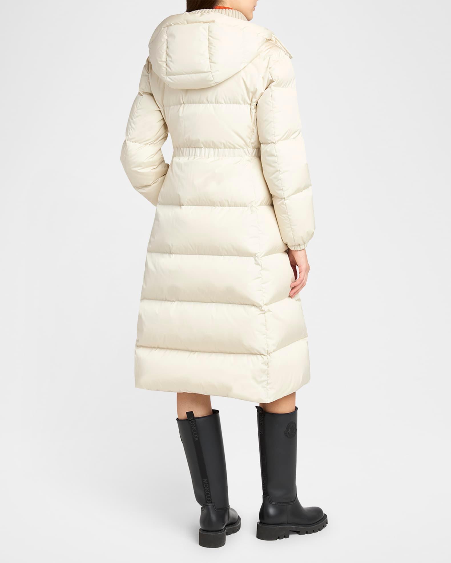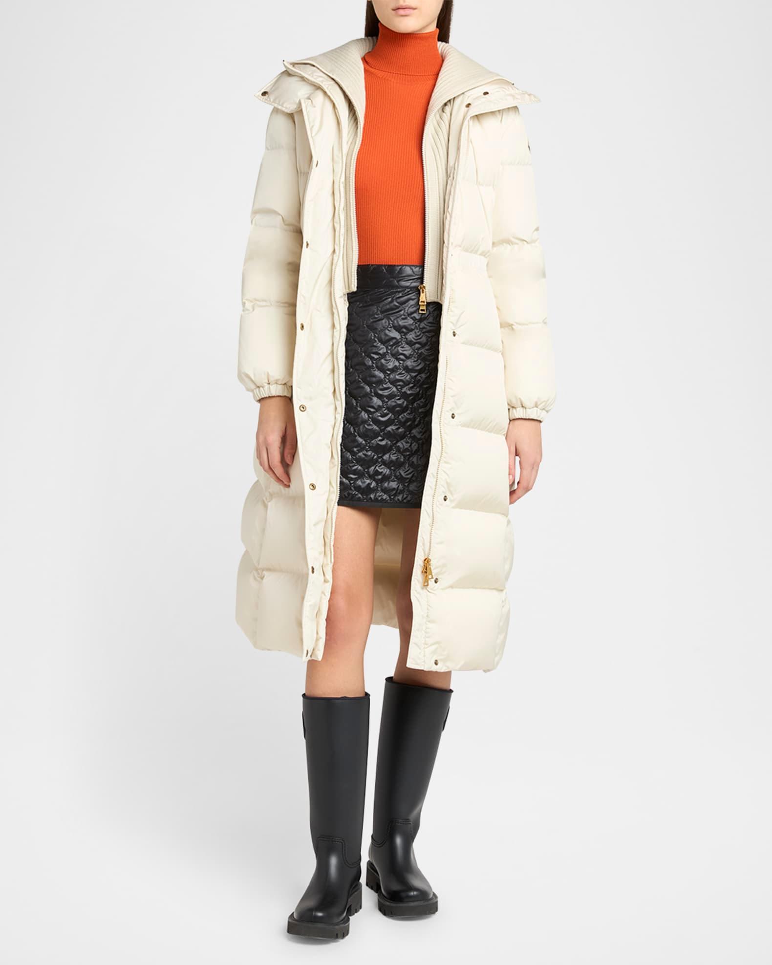 Moncler "Chamer" long quilted puffer coat enhanced with gold-tone hardware Features a detachable rib-knit dickey with zip-front Hooded neckline Long sleeves with elastic cuffs Signature embroidered logo patch on left sleeve Cinched waist Zip pockets Classic fit Hem falls below the knee Two-way zip-front with snap placket Nylon/polyamide Fill: Down/feather Lining: Nylon Hand wash Imported