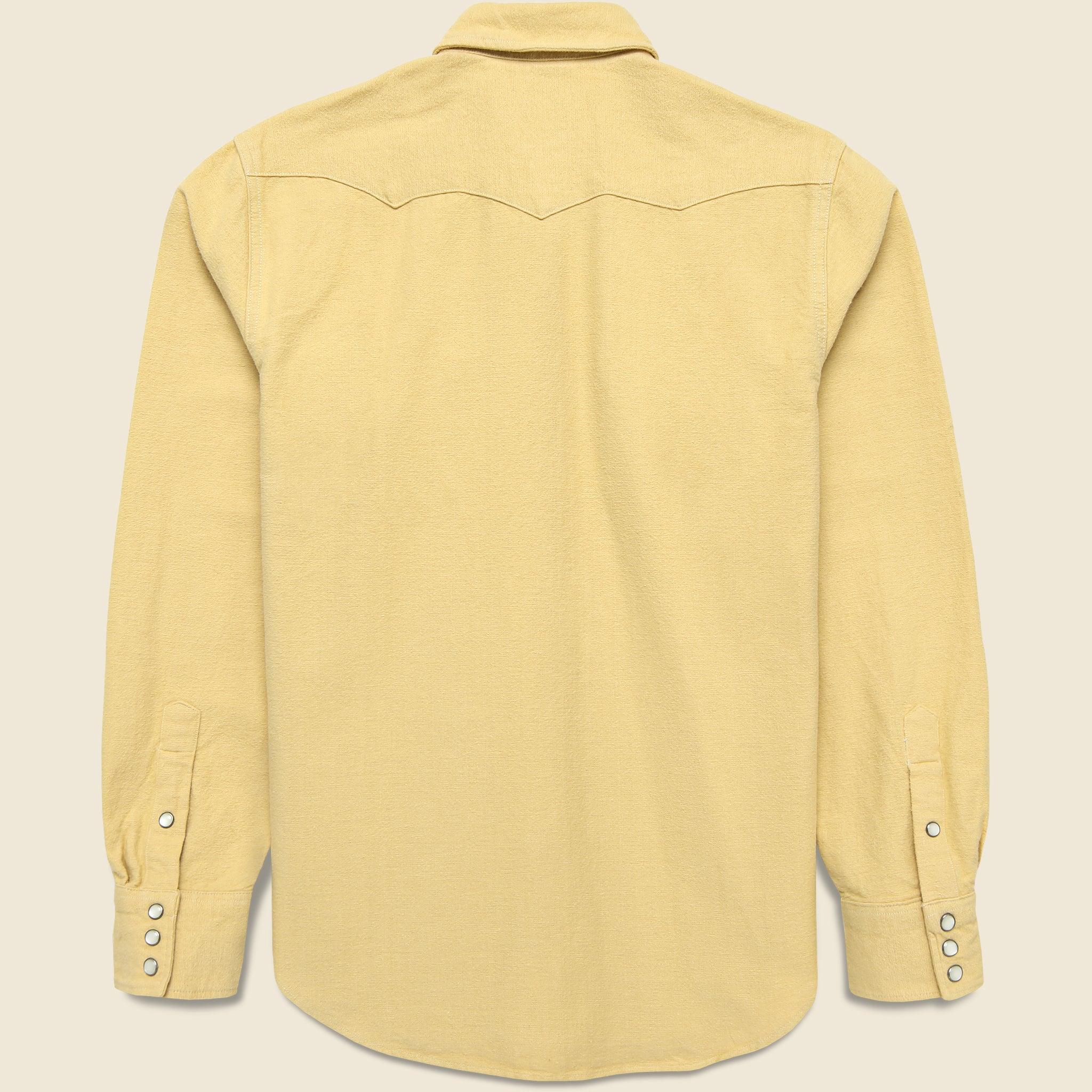 This Chamois Western Shirt from Double RL is made with super soft, midweight cotton chamois that’s been heavily brushed for a timeworn, comfortable finish. It’s tailored with a slim fit through the chest and the sleeves and finished with a classic Western-style yoke, a pearl snap placket, two chest pockets with boot stitch details, and a slightly curved hem to round things up. Soft cotton chamois flannel Brushed for extra softness Western-style front and back yoke Pearl snap placket Two chest pockets with snapped closures Top metal concho button closure Long sleeves with snapped barrel cuffs Slim fit that runs true to size We recommend taking your normal size or taking one size up for a more relaxed fit Materials: 100% cotton The following measurements are for size Medium: Chest: 42” | Shoulder: 17” | Sleeve: 33” | Length: 29”