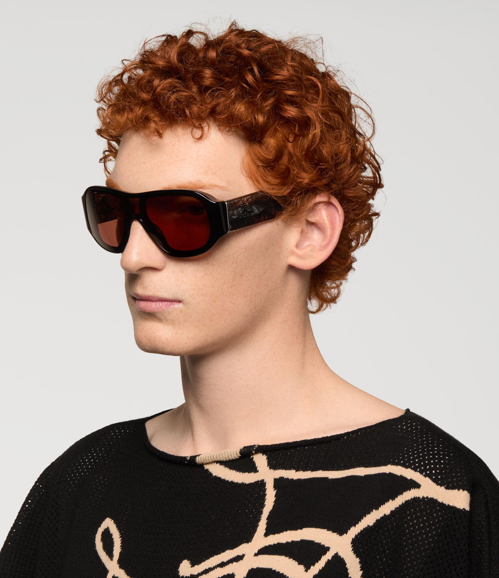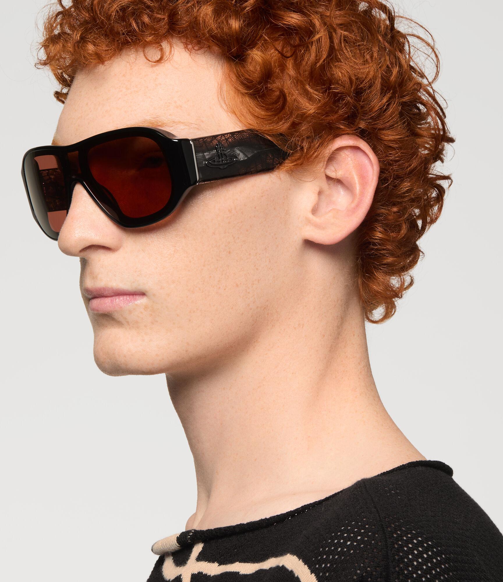 The Chamonix sunglasses offer a retro-futurist aesthetic, defined by a wraparound, visor-inspired silhouette. Crafted in glossy black acetate and contrasted with a web-inspired pattern along the arms, the design features tinted lenses framed by a subtle aviator-style rim. At each temple sits an orb which symbolises tradition, encircled by the celestial rings of Saturn, symbolising the future.