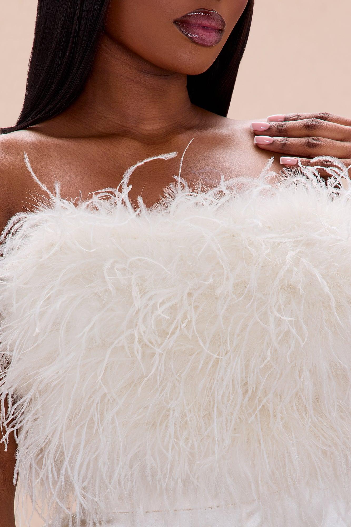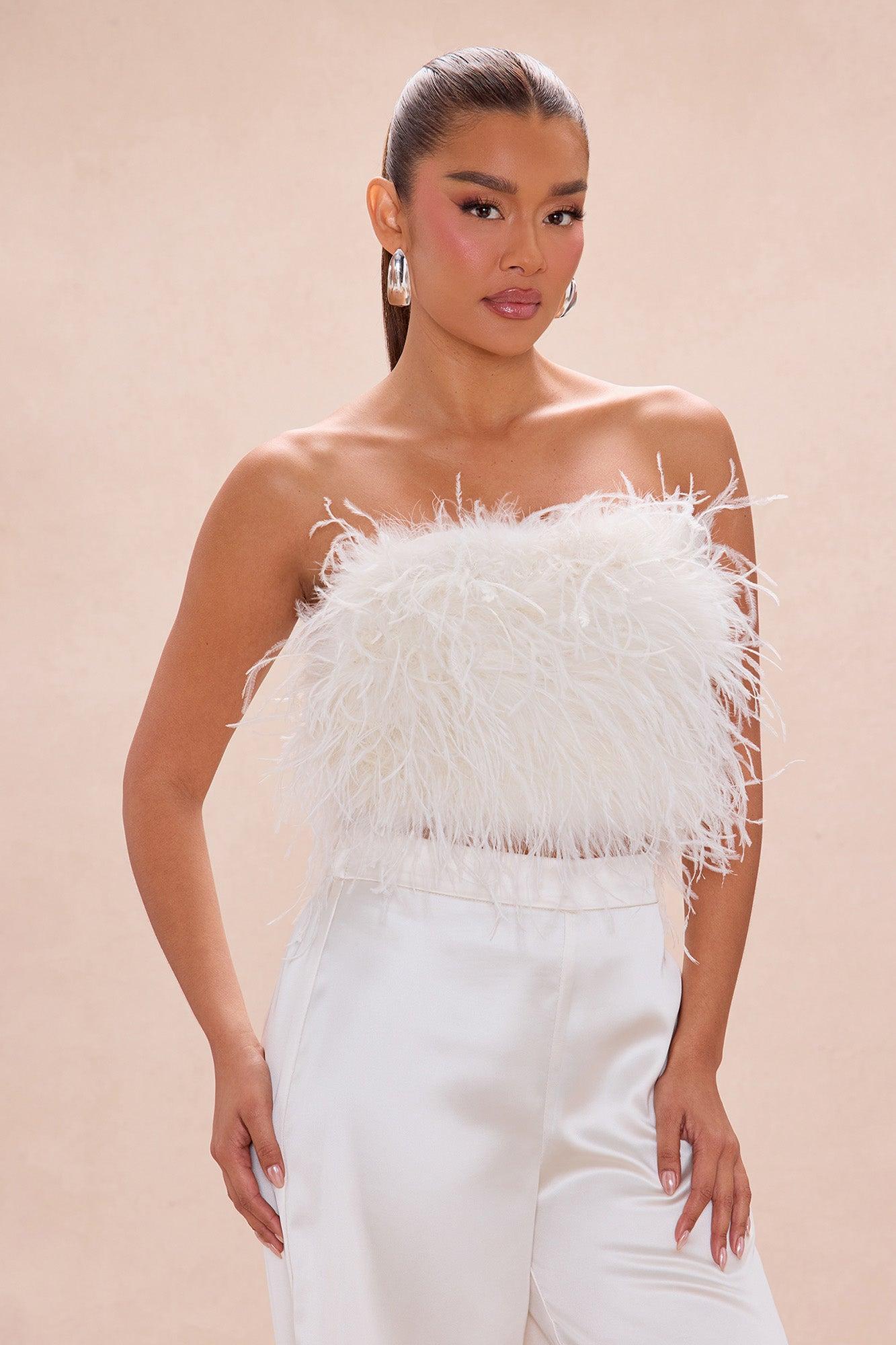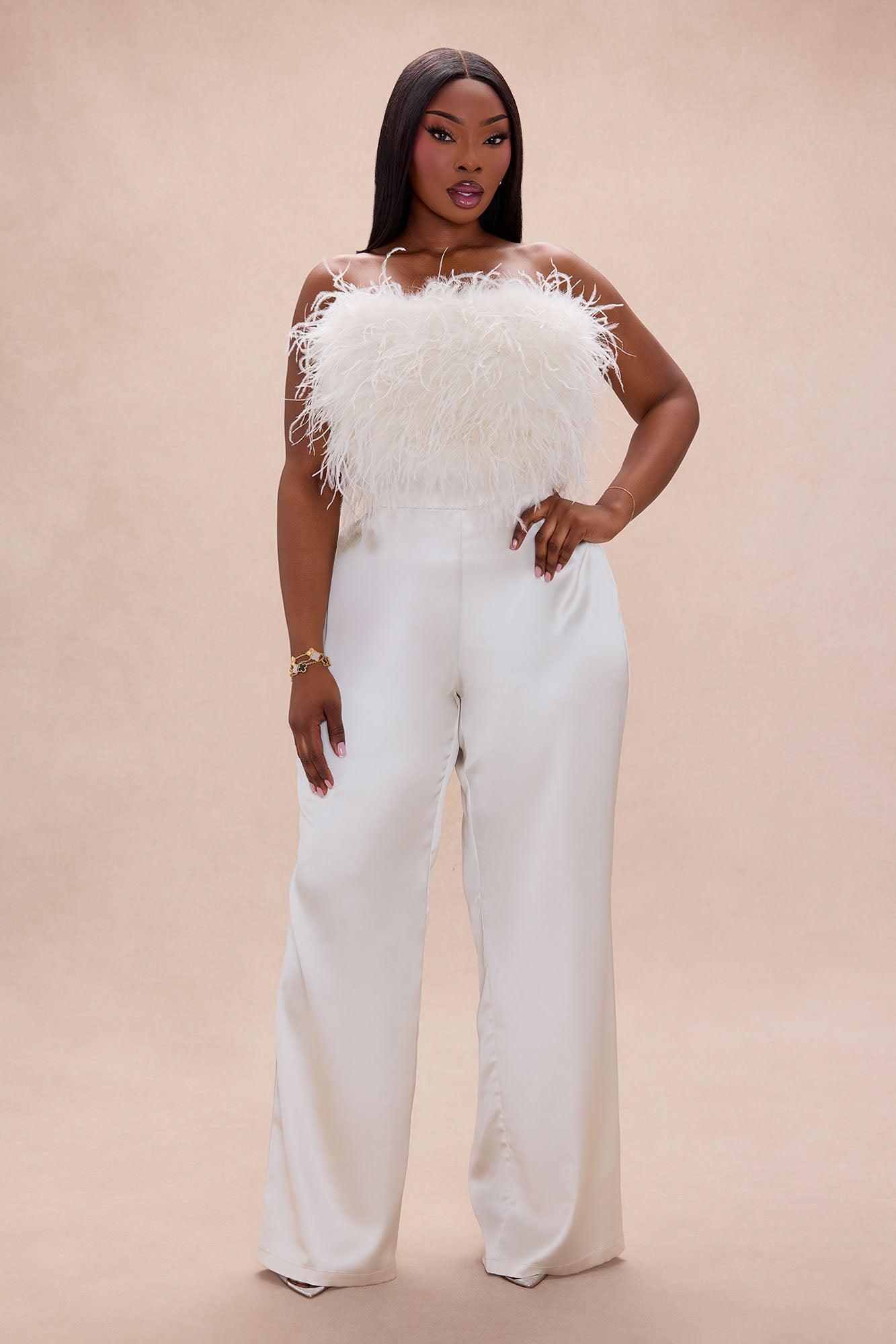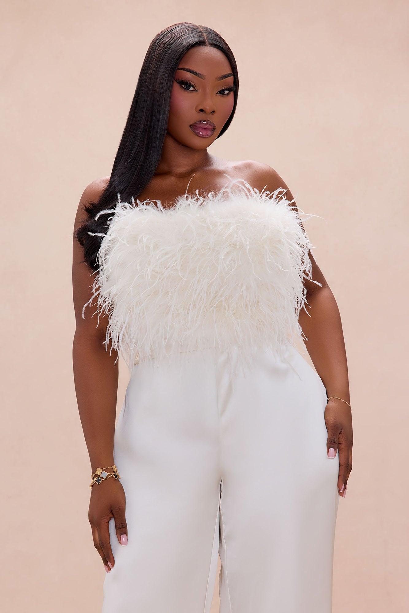 Available In Champagne And Dusty Blue. Pant Ensemble Strapless Feathered Bandeau Top Straight Neckline Grip Tape Back Zipper Closure Lined Non Stretch Satin Pant Pockets Hidden Back Zipper Closure PROP65-NO Shell 1: Ostrich Feather Shell 2/Pants: 95% Polyester 5% Spandex Lining: 96% Polyester 4% Spandex Imported