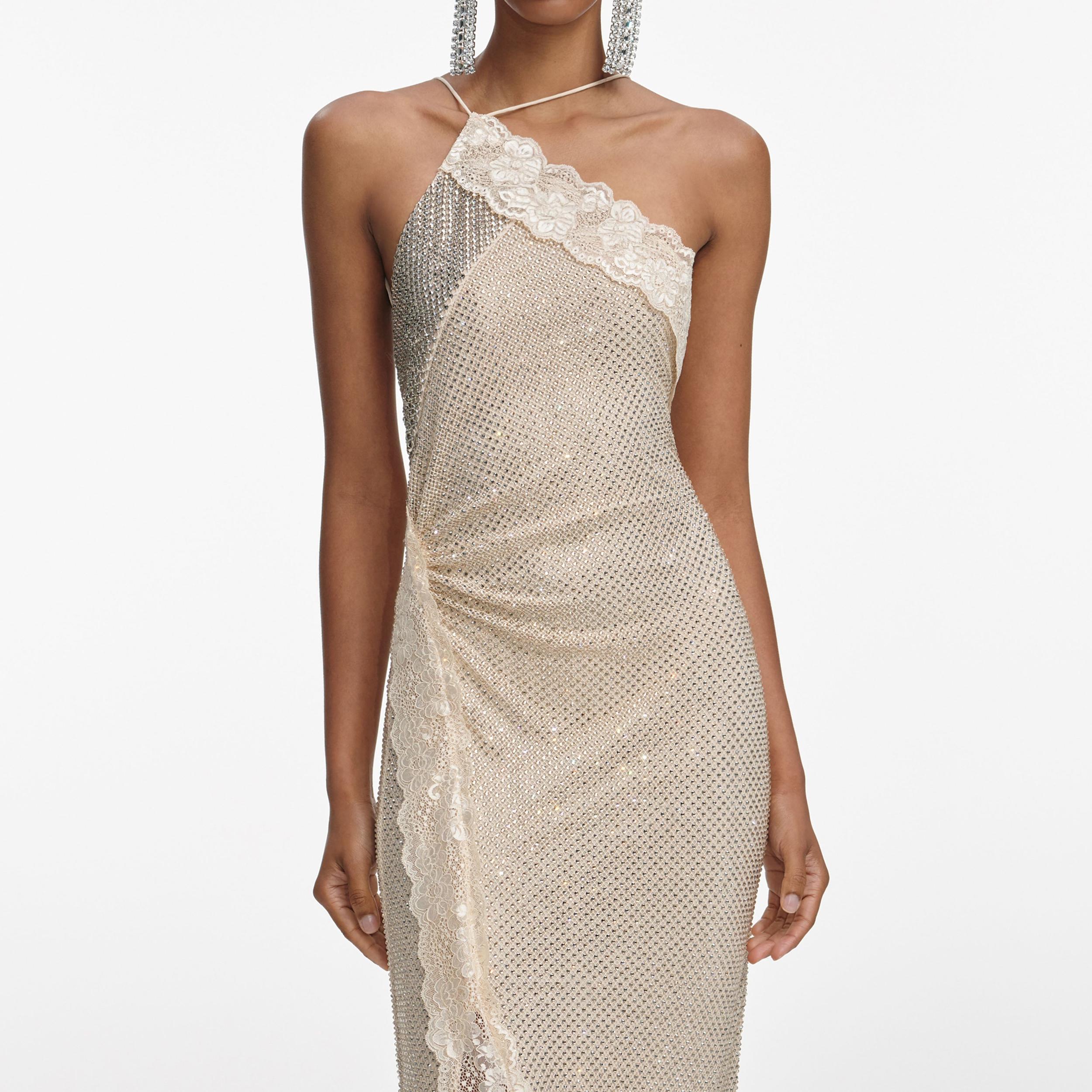Shimmering like golden armour, this maxi dress boasts head-to-toe rhinestone embellishment in a dreamy champagne hue. Lace trim traces the asymmetric neckline and sultry side split for added allure.Fitted styleThis style has minimal stretchZip closure at sideOpen back designLace trimsModel is 5ft10/178cm and wears a size UK 6