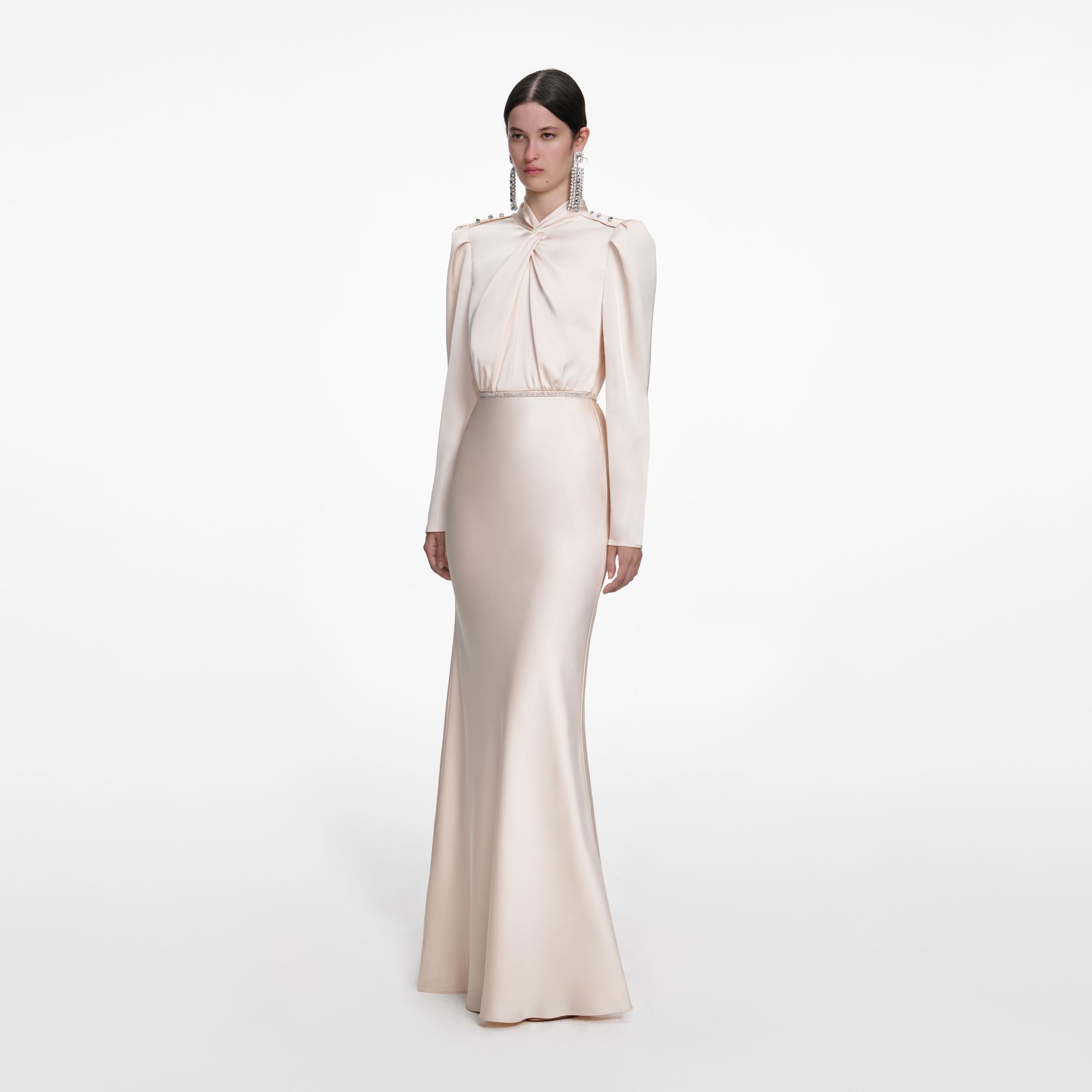 Celebratory shine from head-to-toe comes courtesy of this champagne satin maxi dress. Button detailing at the shoulders frames the chic twist neck – pair with sky-high heels to make a big entrance.True to sizeFabric has slight stretchConcealed zip closure at back Faux button embellishmentRemovable beltModel is 5ft10/178cm and wears a size UK 6