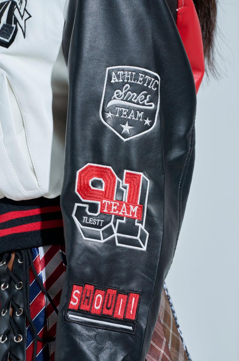 Who runs the world? You, in The AKIRA Label Champions League Faux Leather Bomber. This sporty-chic jacket is crafted from a buttery smooth, supple vegan leather fabrication and features a three-tone, half-and-half color block design, elasticized ribbed knit hems with contrast stripes, a standing collar, long sleeves with cinched cuffs, welted side slant pockets, an elasticized waistband, and a sleek inner lining. Complete with sports-themed inspired embroidered patches and text on the chest and sleeves, a snap button front panel with a concealed metallic zip closure, and a boxy, cropped silhouette. Pair with baggy cargo jeans and platform sneakers for a finished look. - 67% PU 20% Polyester 13% Viscose- Spot Clean Only- No Stretch- Imported (all measurements approximate from size small)- 19.5” Shoulder to Hem- 19” Shoulder to Shoulder- 22” Sleeves- Model is 5’8” and is wearing size small Product ID: 436747