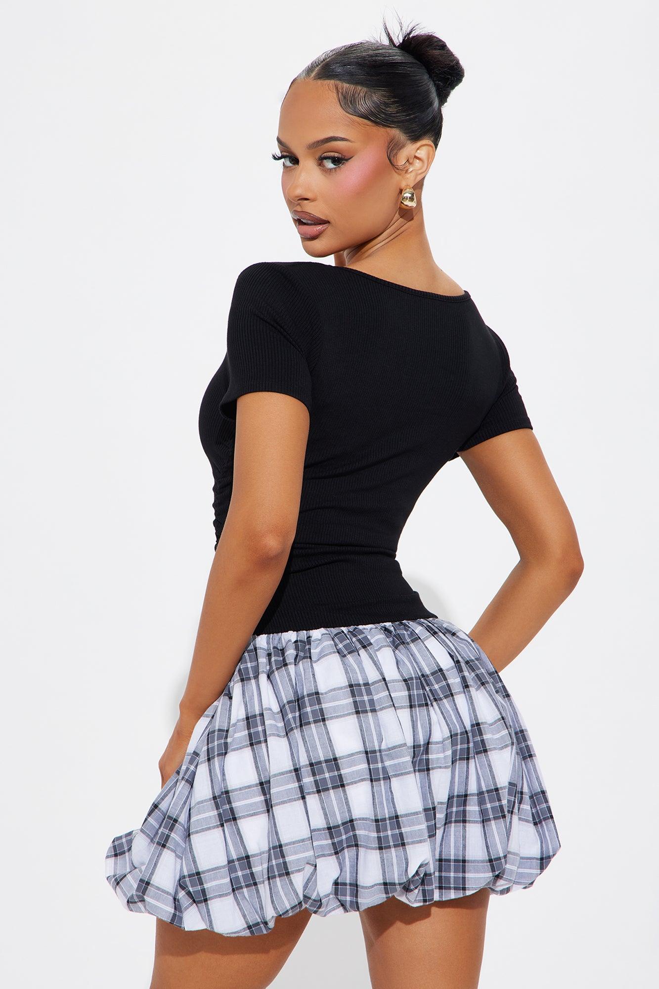 Available In Black/combo. Plaid Bubble Mini Dress Square neckline Short sleeves Ruched sides Bubble hem Stretch Length measured flat = 32" Disclaimer: Plaid Placement On Skirt Will Vary Self 65% Polyester 30% Rayon 5% Spandex Contrast 100% Cotton Lining 100% Polyester Imported California Proposition 65WARNING: Cancer and Reproductive Harm - www.P65Warnings.ca.gov.