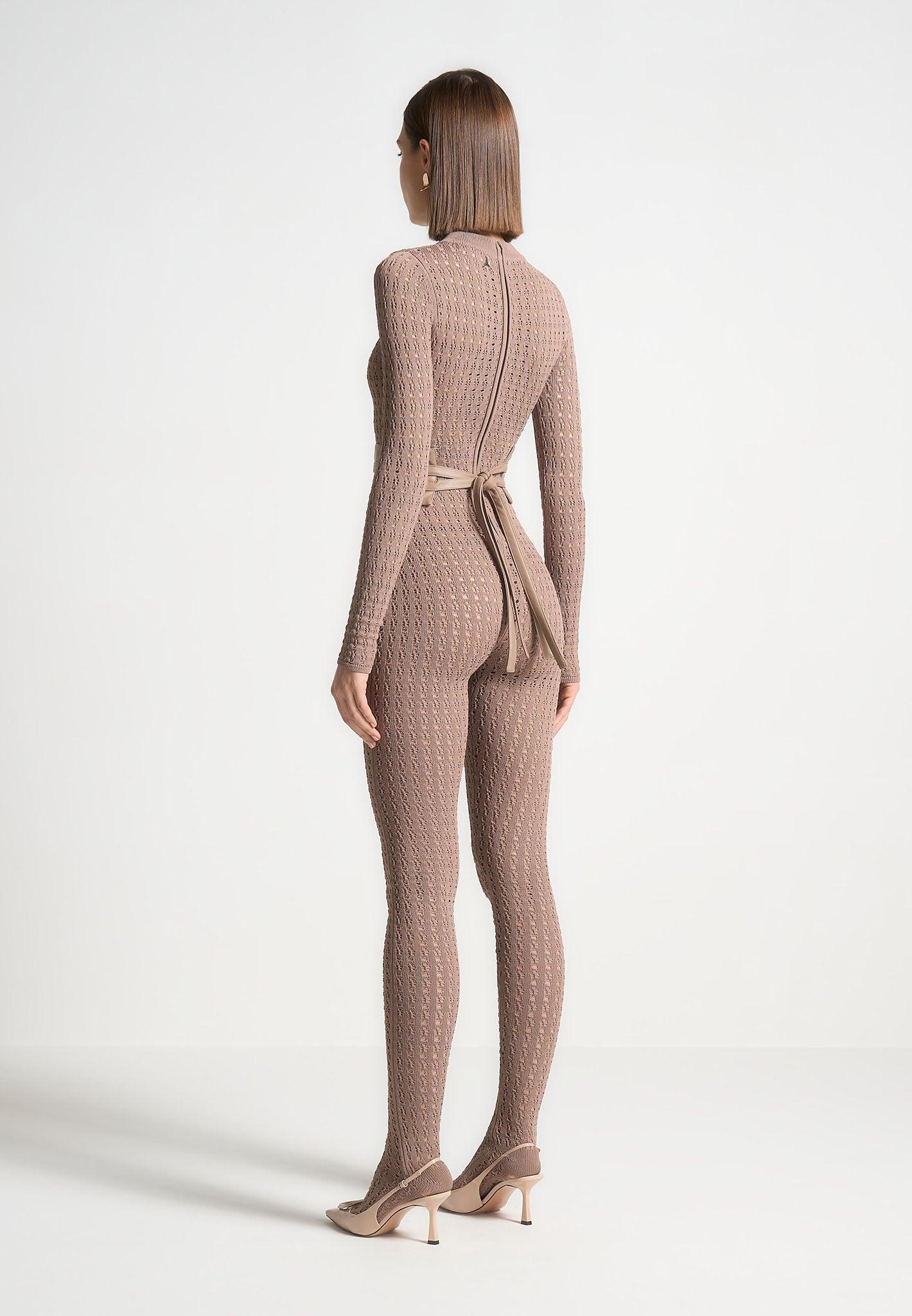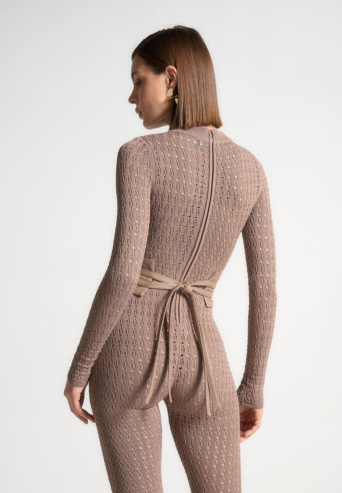 Chantal - Pointelle Knit Long Sleeve Jumpsuit with Belt - Taupe Female