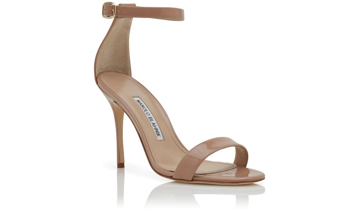 Beige patent leather ankle strap sandals with stiletto high heel.