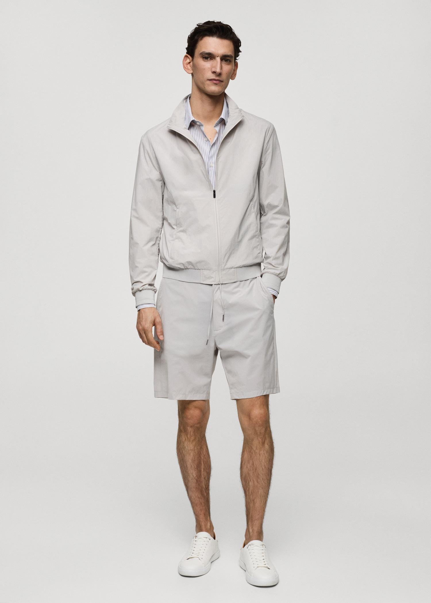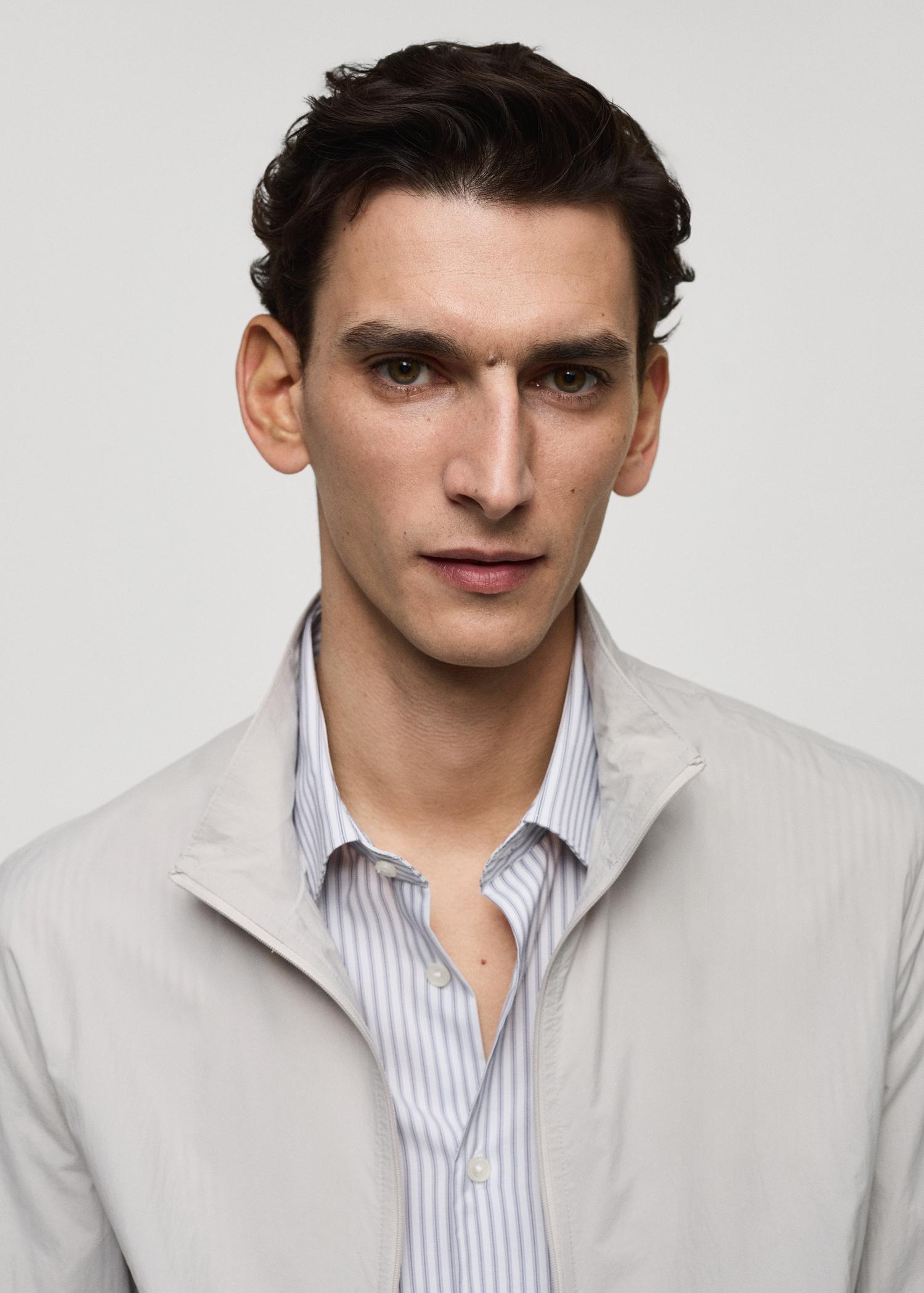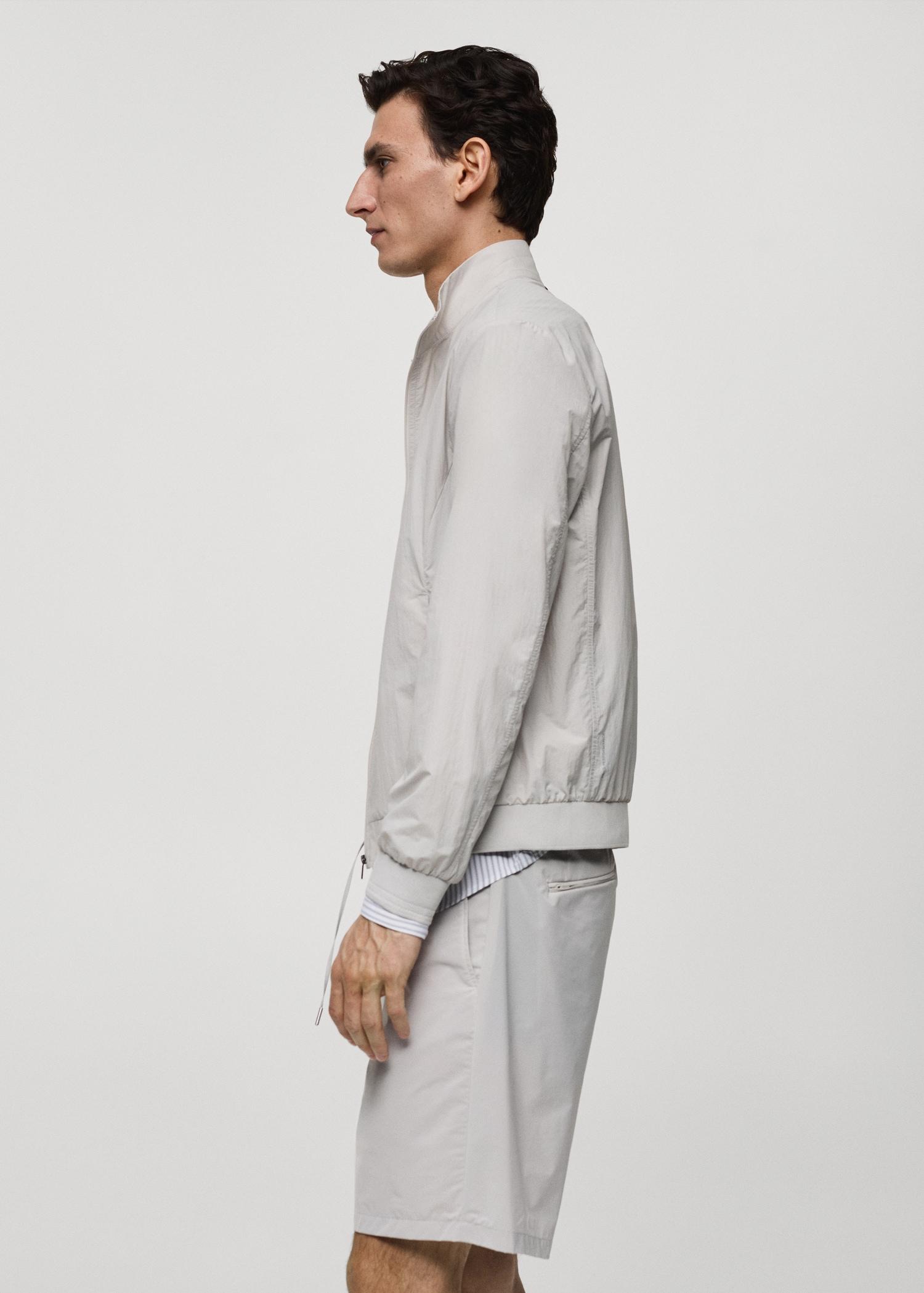 Performance Collection. Easy-care fabric. Bomber design. Funnel neck. Front zipper closure. Long sleeves with elastic cuffs. Elastic hem. Ribbed finishes on sleeve and hem. The model is 185 cm tall and wears a size M. Water-repellent: The durable finish of this garment protects against light rain, repelling contact with water and raindrops. Thermoregulator: This fabric offers optimal breathability to keep you at a stable temperature. Two welt pockets on the front. Back length 28.15 in. The Performance collection includes garments made with technical fibers. This selection offers a wide range of advanced features such as bi-stretch, quick-drying, easy ironing, thermoregulating, breathable or water-repellent fabrics, organized into three general categories: Thermoregulating, Functional and Comfort