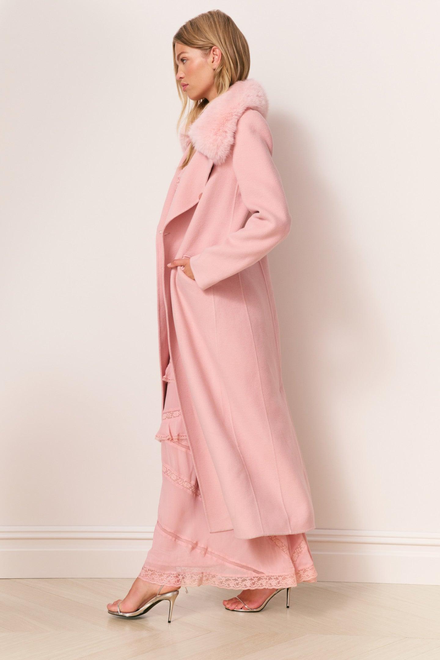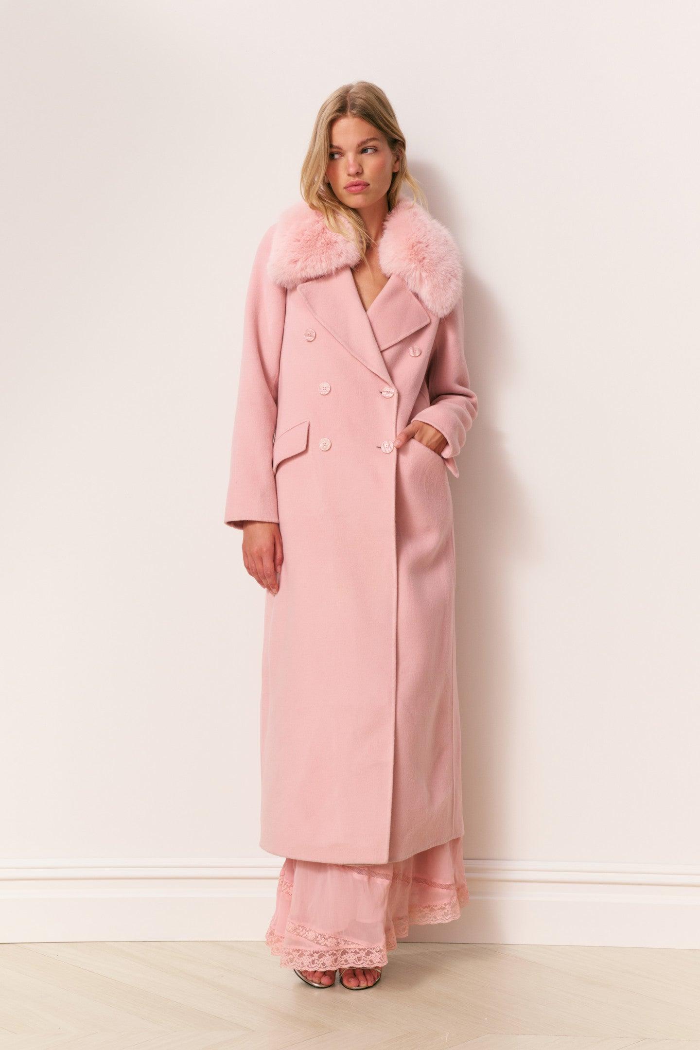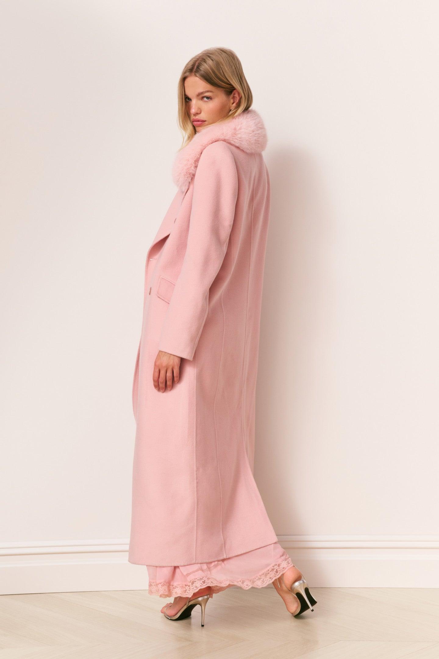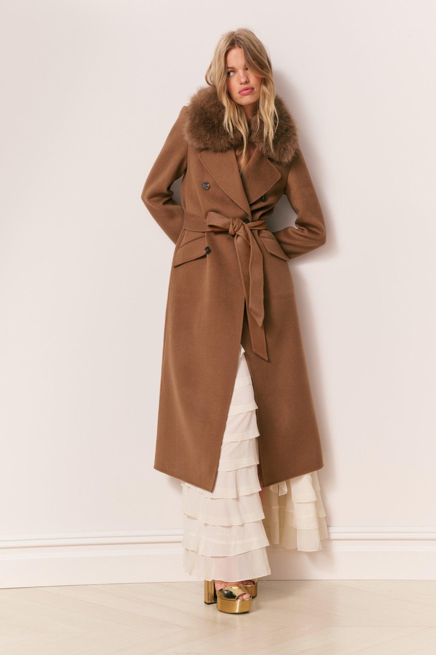 A modern take on Victorian elegance, the Char Coat is crafted in soft double-face wool for a sleek and polished silhouette. This slim, fitted duster features a double-breasted front with a wide lapel and collar, giving it a refined, statement-making profile. Six buttons line the front, complemented by streamlined patch flap pockets, while slim sleeves maintain a clean, tailored shape. A detachable faux fur collar adds an optional touch of luxury, letting you style the coat for either cozy drama or understated sophistication. Falling to mid-calf, Char balances structure and romance for a look that is timeless yet modern. 100% Wool Double-breasted duster coat; slim, fitted silhouette Victorian-inspired wide lapel and collar Six-button front closure Patch flap pockets Slim sleeves Detachable faux fur collar (attached with buttons)