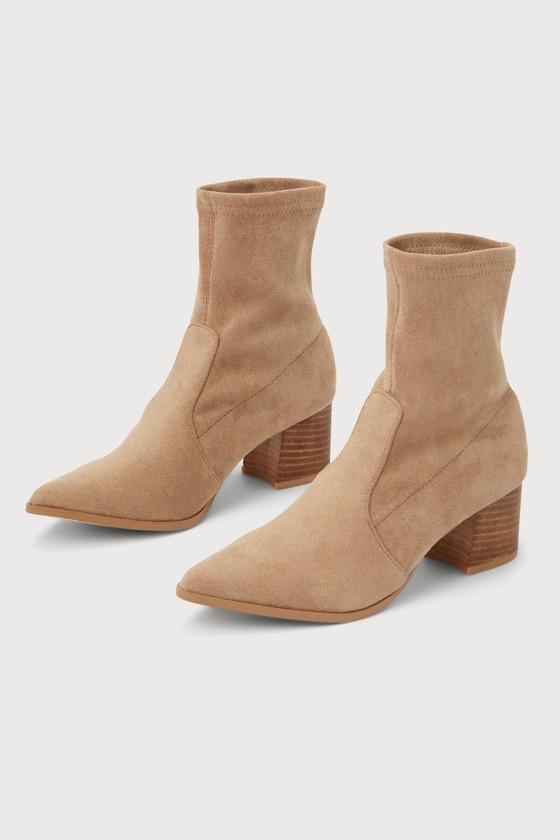 Even when the temperatures start to drop, you'll stay stylish through the changing of seasons with the Lulus Char Mushroom Brown Suede Pointed-Toe Sock Boots! Soft faux suede shapes these chic boots that feature a single sole silhouette and pointed-toe upper that rises to an ankle-high shaft. The sleek slip-on design wouldn't be complete without a cute, wood-look block heel!
